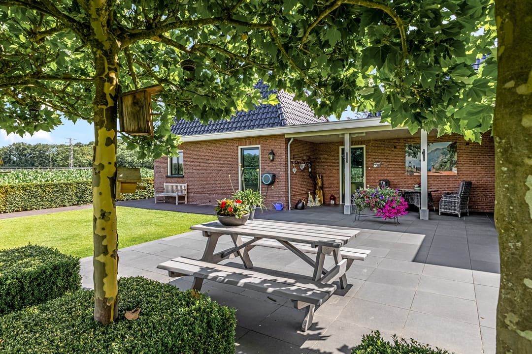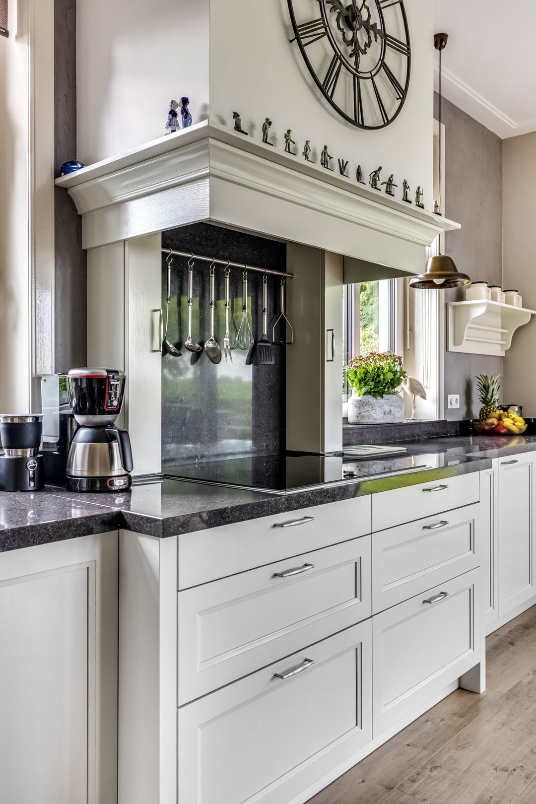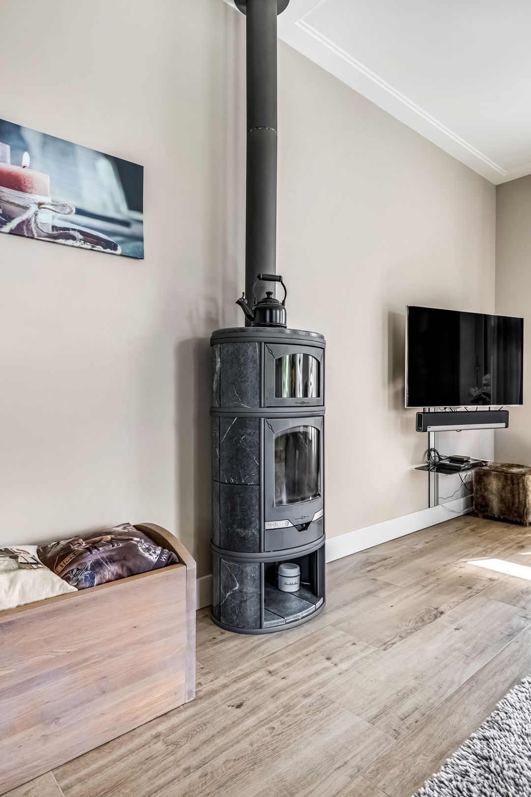 Het landelijke keukenblok met granieten blad is van alle gemakken voorzien, zoals onder andere een inductie-kookplaat, afzuigkap, heteluchtoven/magnetron, vaatwasser en koelkast. De woonkeuken biedt voldoende ruimte voor het plaatsen van een grote eetkamertafel voor het hele gezin en staat via een grote schuifpui in verbinding met de tuin en overkapping. De grote schuifpui geeft niet alleen prachtig zicht op de tuin en achterliggende landerijen, maar ook veel lichtinval in de ruimte.