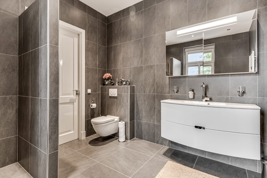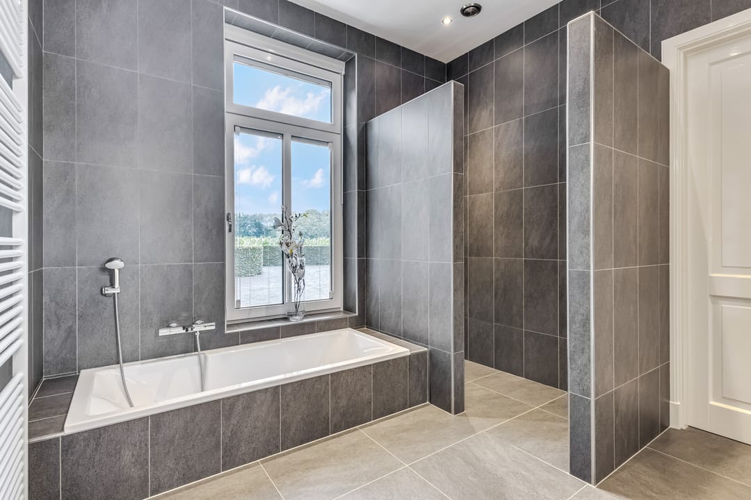 Op de begane grond bevindt zich een slaapkamer met aansluitend een ruime badkamer met ligbad, inloopdouche, wasmeubel, toilet en decorradiator om de handdoeken te drogen. Daarnaast is er ook een separaat toilet.