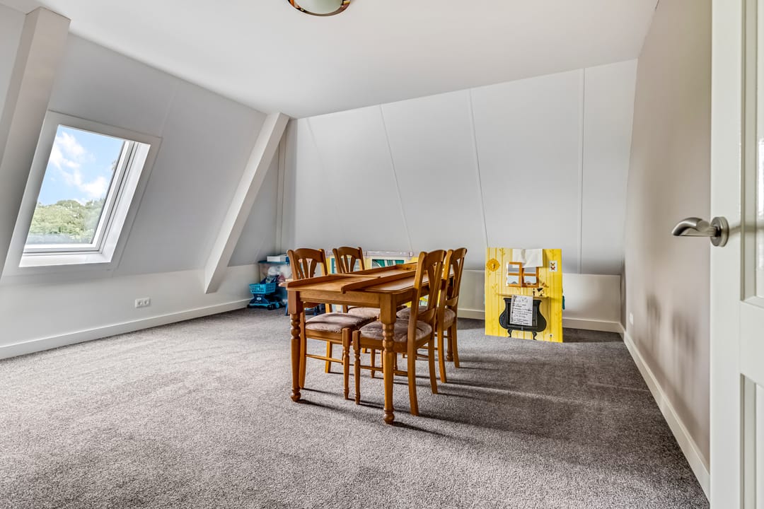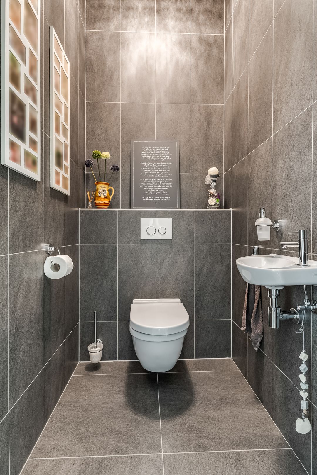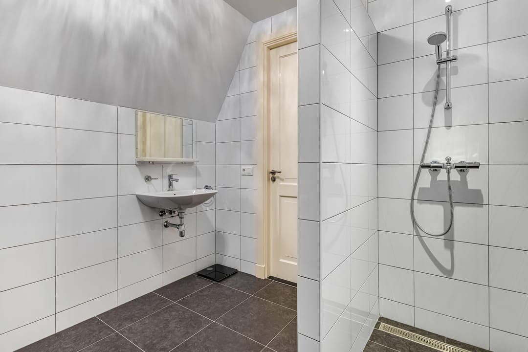 Ook bevindt zich op de verdieping een tweede badkamer in neutrale kleurstelling. Deze beschikt over een douche, wastafel en toilet.