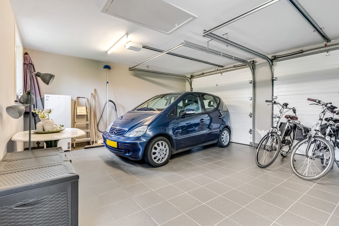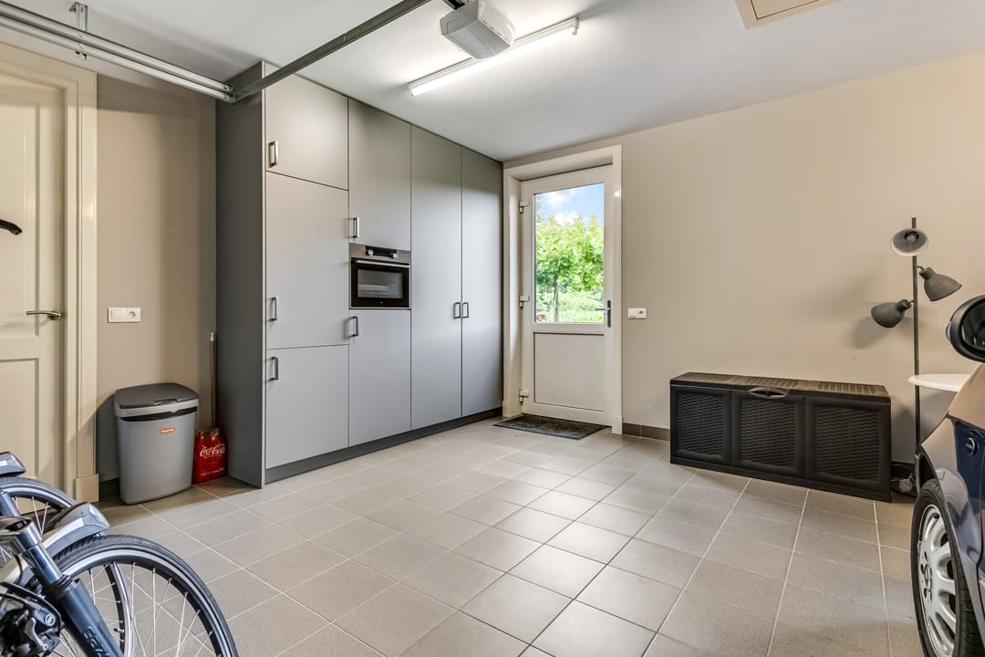 Zowel de garage als de hal hebben een achter entree. De ruime dubbele garage beschikt over automatisch op afstand bedienbare Horrmann deuren, een vaste kastenwand voorzien van een koel-/vriescombinatie, (stoom)oven en opstelplaats voor het stofzuigsysteem. Tot slot is er een zolderruimte welke bereikbaar is middels een vlizotrap.