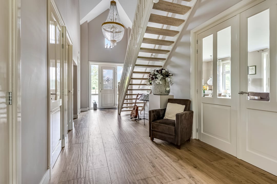 Via de hoofdentree wordt u ontvangen in de royale hal. De stijl die u aantreft bij het binnengaan van deze villa is door de gehele woning doorgevoerd. De entree met vide en hoge plafonds geven de hoofdentree extra allure.