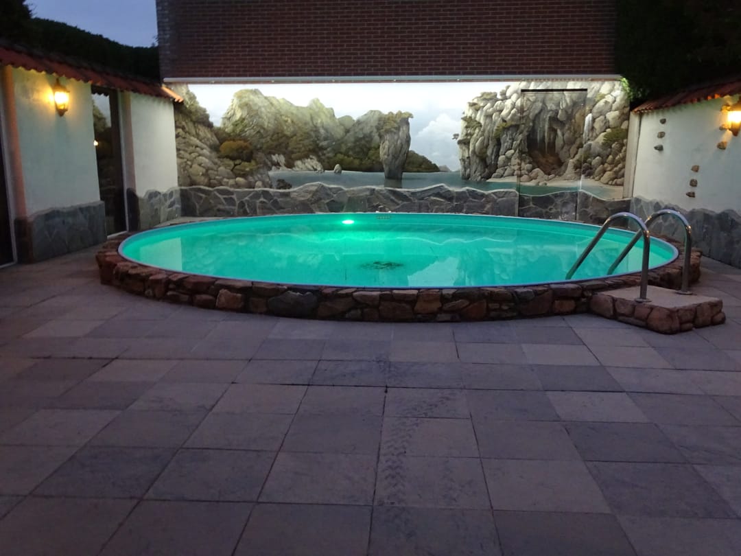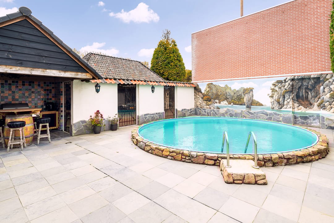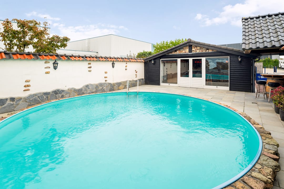 Gezellige buitenplaats met fraai rond zwembad (verwarmd) en veranda met buitenkeuken.