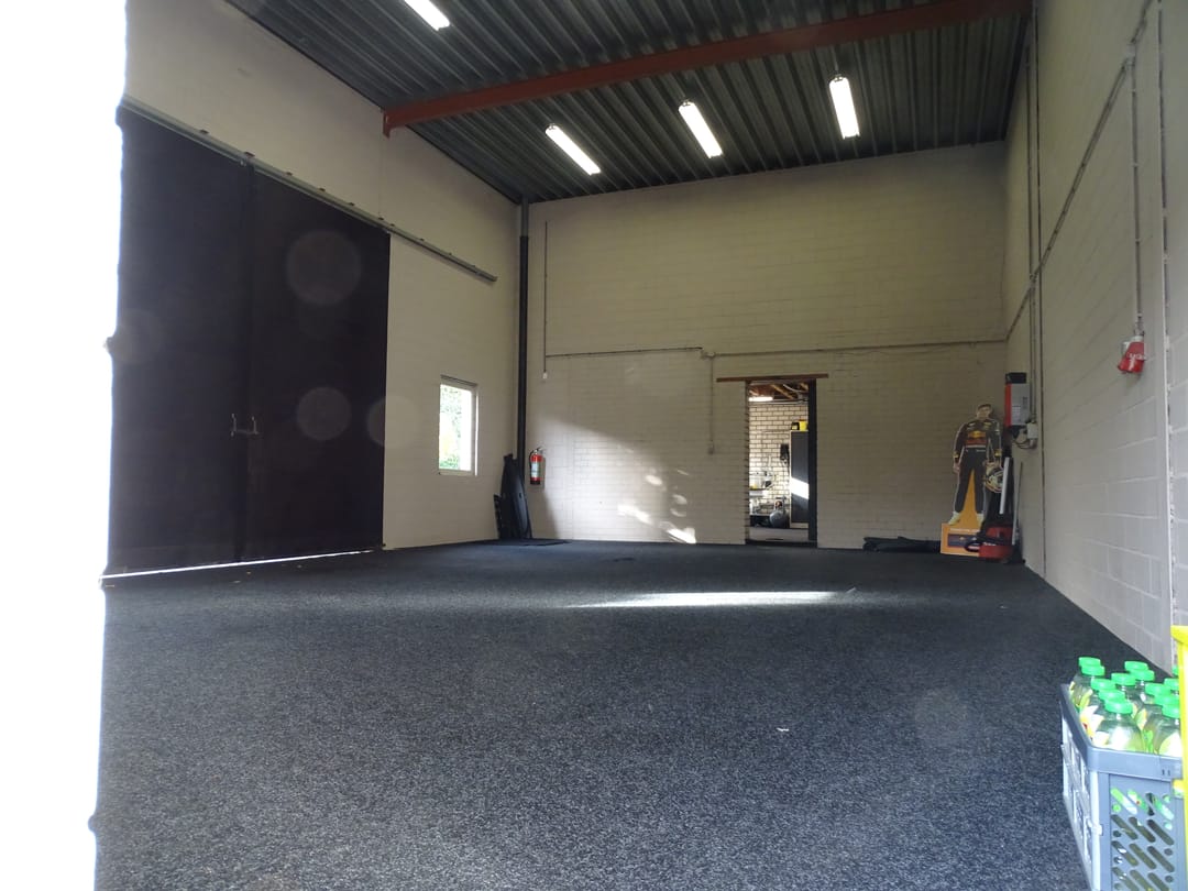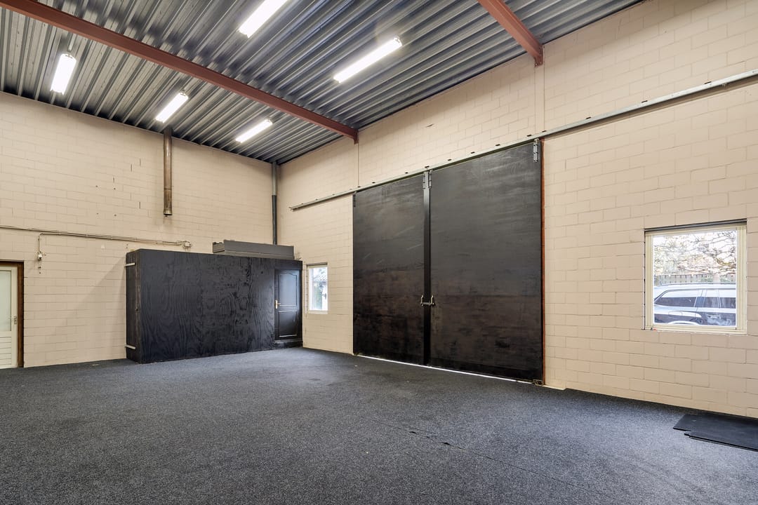 Hoge bedrijfsruimte met brede toegangsdeur. Ideaal voor opslag of als werkruimte.