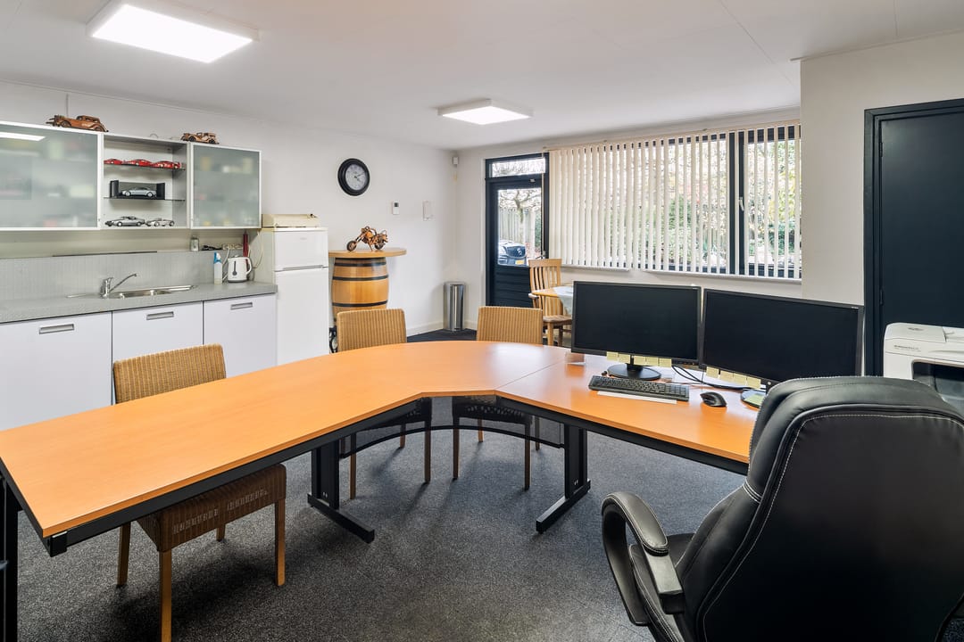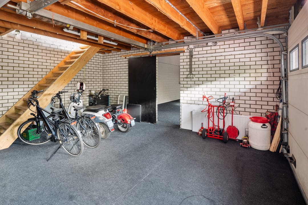 Direct achter het kantoor gelegen inpandige garage groot ca. 30 m2 met dubbele elektrische roldeur.