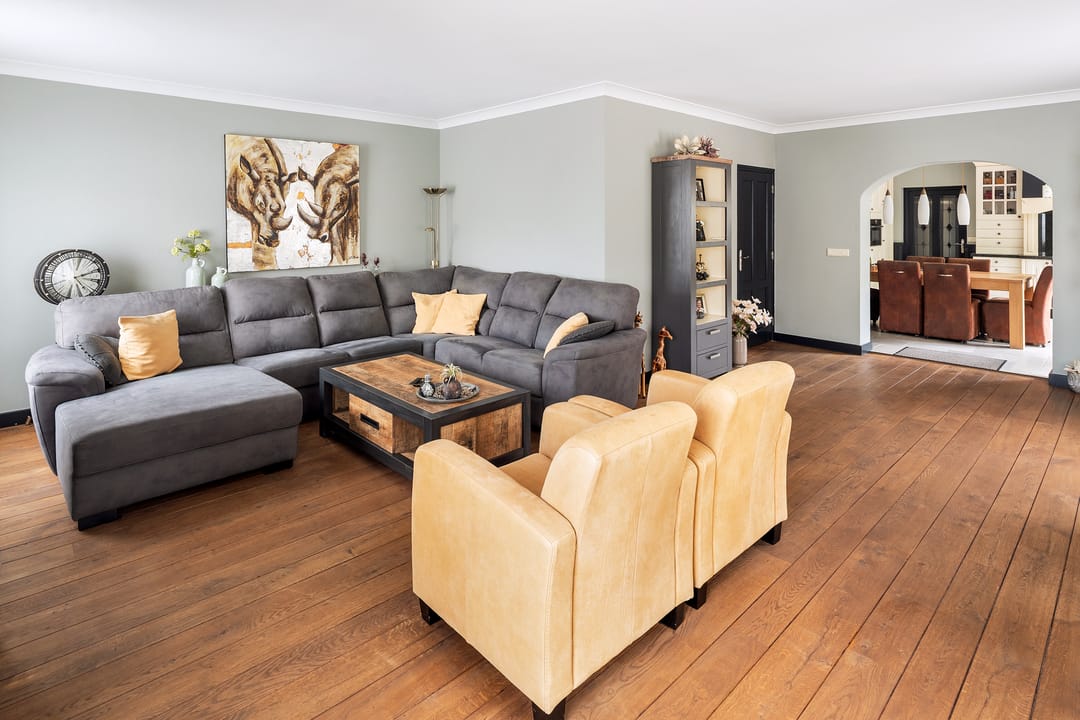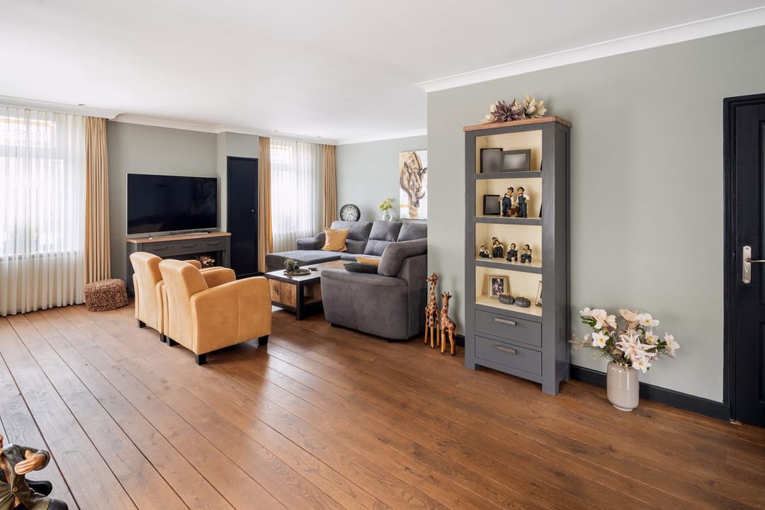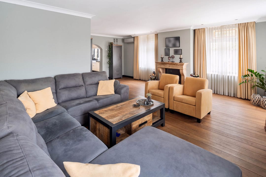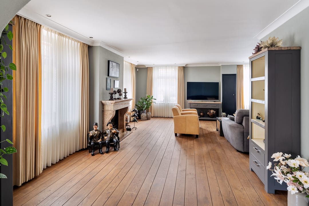 Royale woonkamer voorzien van een massief eiken planken vloer, schouw met gashaard, strak gestuukte wanden met hoge plinten en een gestuukt plafons met sierlijsten en spotjes. De vele ramen bieden een fijne lichtinval en de warme kleuren een knusse sfeer. In de woonkamer is airco aanwezig.