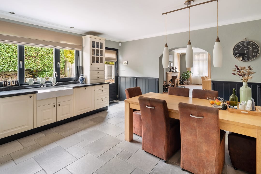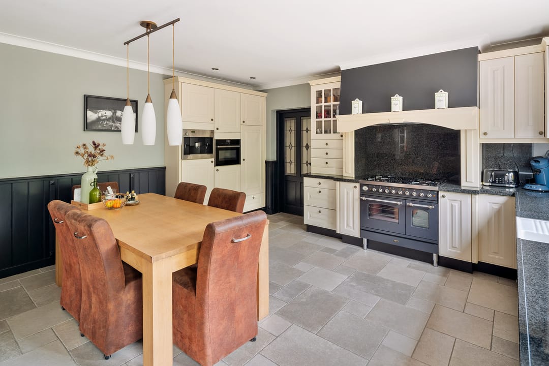 De klassieke keuken is voorzien van een tegelvloer en is in een hoekopstelling geplaatst. Voorzien van een granieten aanrechtblad en een dubbele keramische gootsteen aan de raamzijde. De keuken beschikt over een brede schouw met daaronder een luxe Boretti fornuis met 6 pitten en 2 ovens en een vaatwasser.