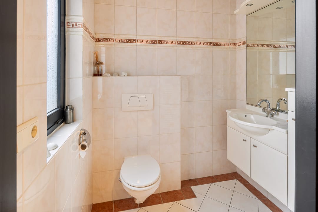 Ruim volledig betegeld hangtoilet met wastafel en meubel.