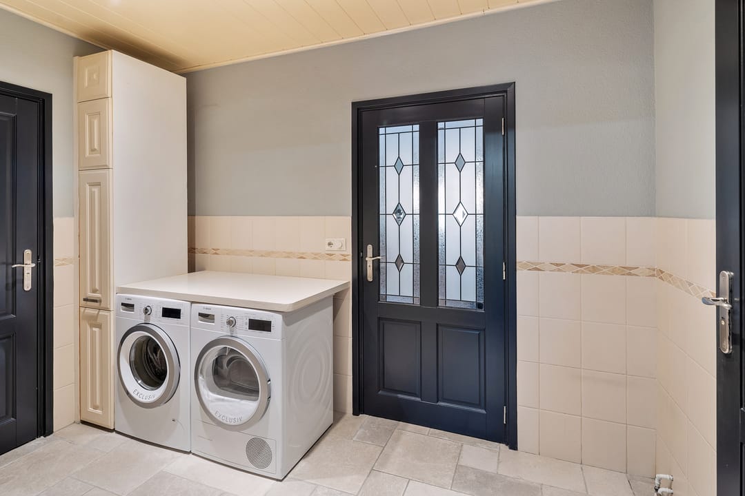 Praktische bijkeuken met aansluitingen waspparatuur.