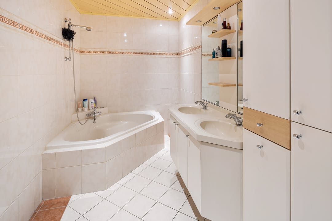 In dezelfde stijl volledig betegelde badkamer voorzien van een ligbad en dubbele wastafel met meubel.