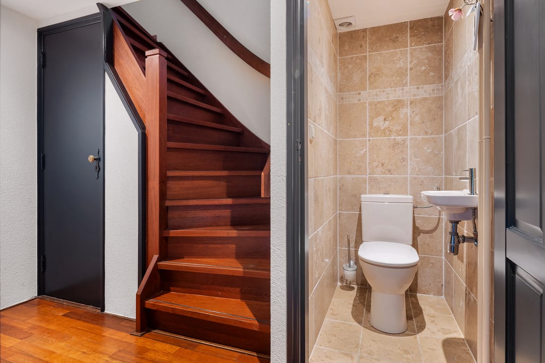 Portaal met toilet met fontein en toegang tot de kelder groot ca. 6 m2.