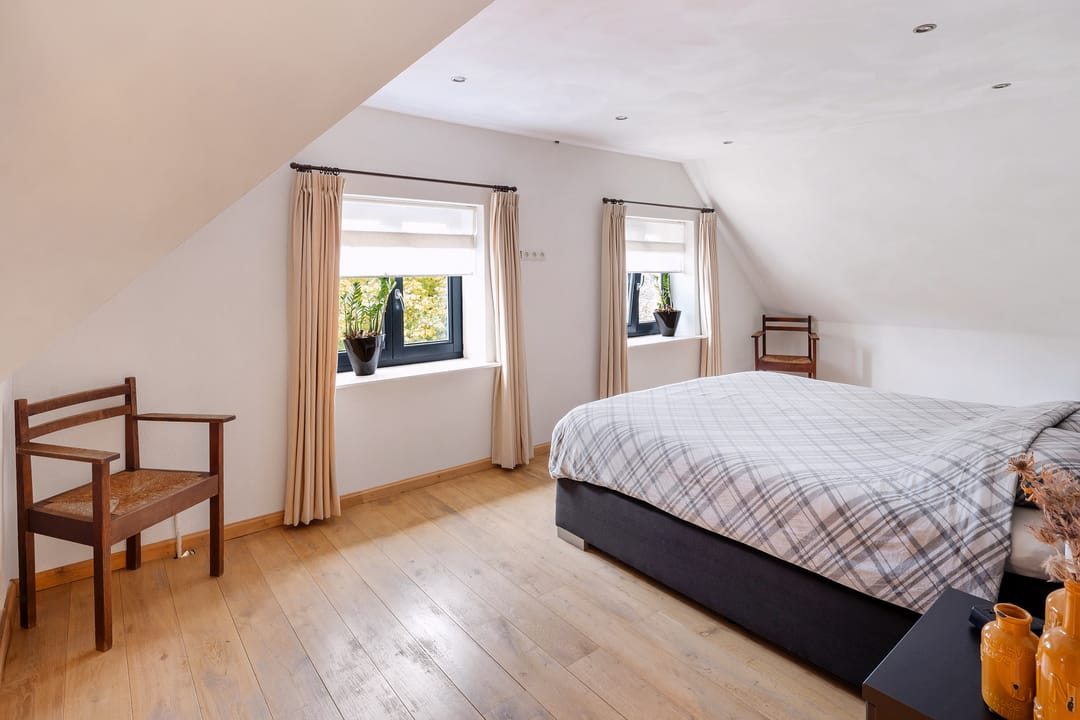 Op de ruime overloop bevindt zich een vaste kast. De drie royale slaapkamers, van ca. 10, 15 en 18 m², zijn voorzien van een laminaatvloer, gestuukte wanden en een plafond met inbouwspots. Eén slaapkamer heeft zelfs een airco.