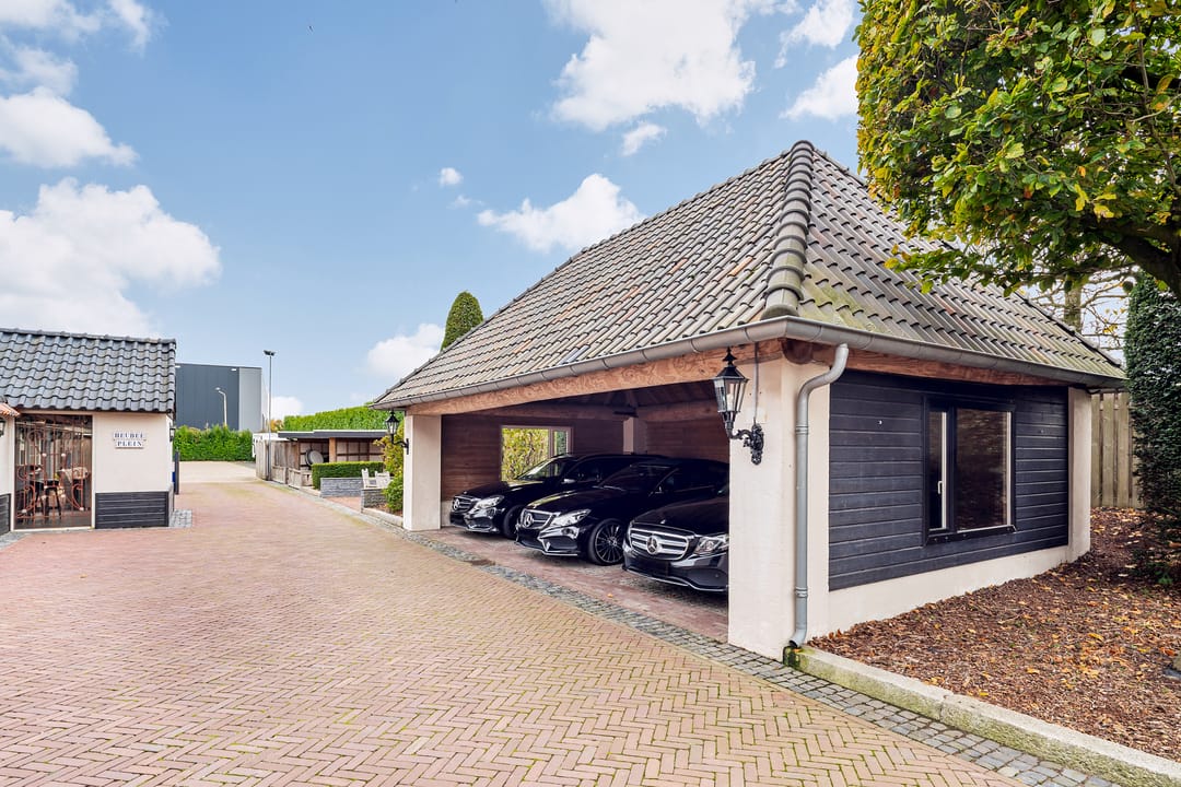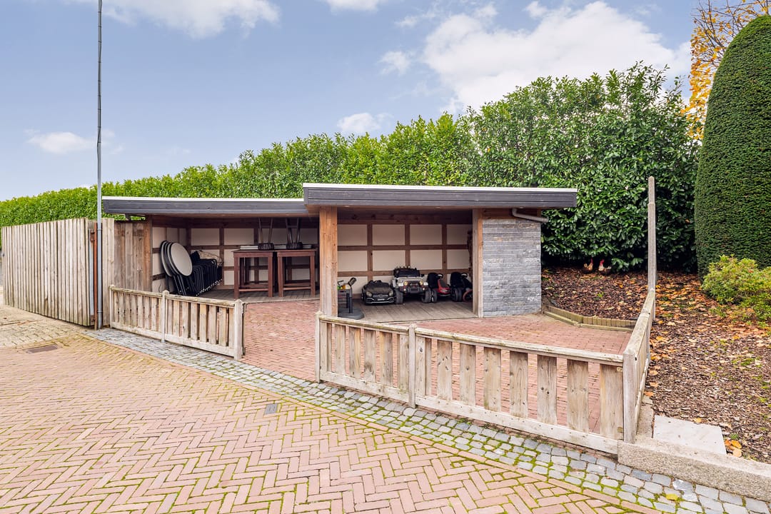 Op het terrein is een grote luxe carport gerealiseerd opgetrokken uit hoogwaardige materialen zoals houten balken en een pannen dak.