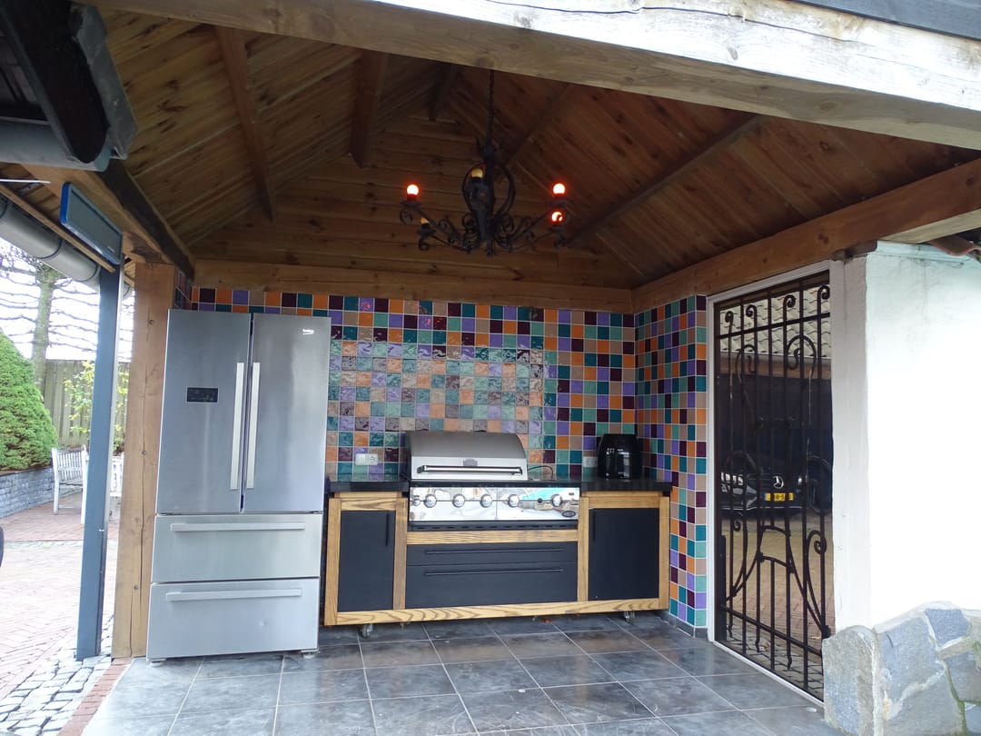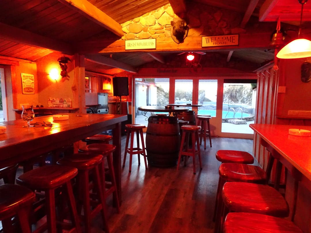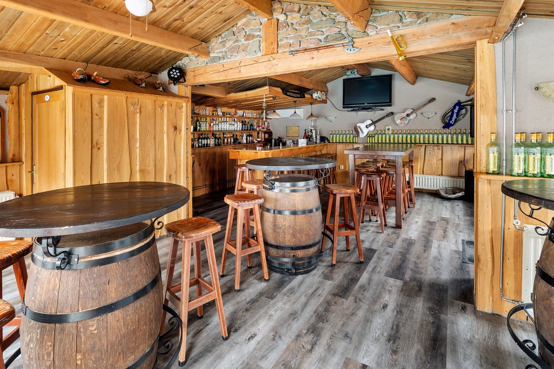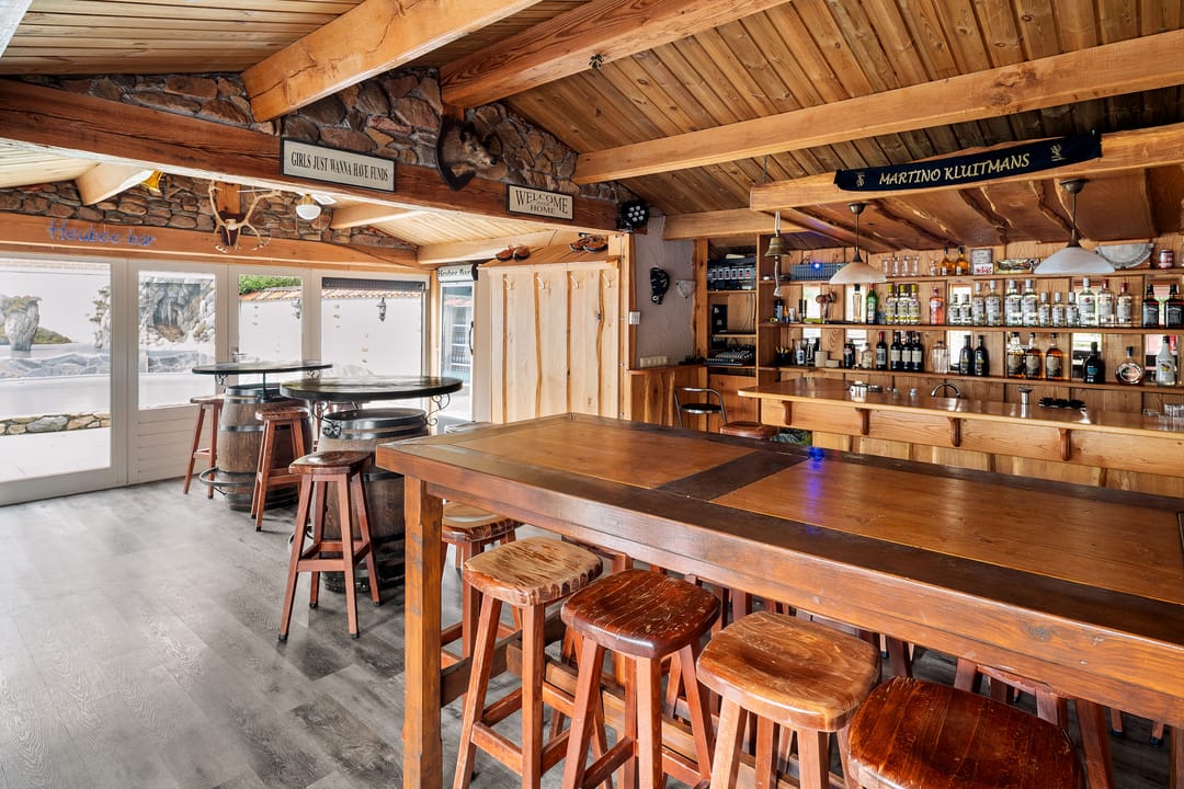 Aansluitend kom je in het volgende bijgebouw wat is getransformeerd naar een gezellig man cave met volwaardige bar en toiletvoorziening. Luxe afgewerkt met houten balken, lambrisering en voorzien van airco om te verwarmen of te koelen.