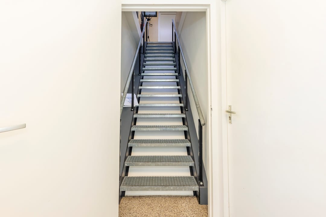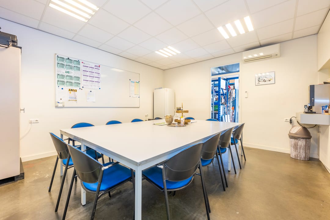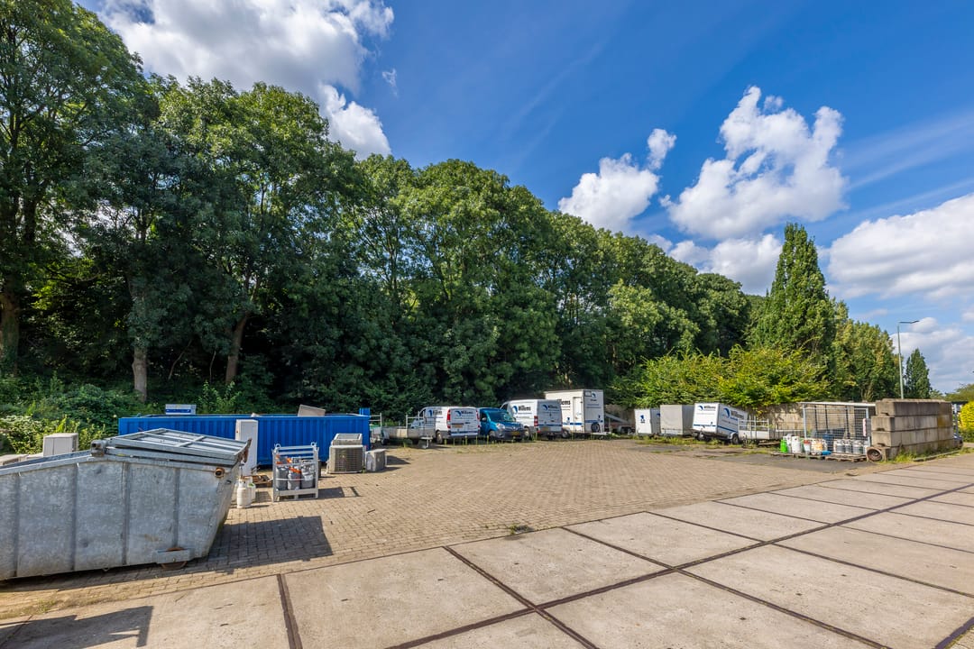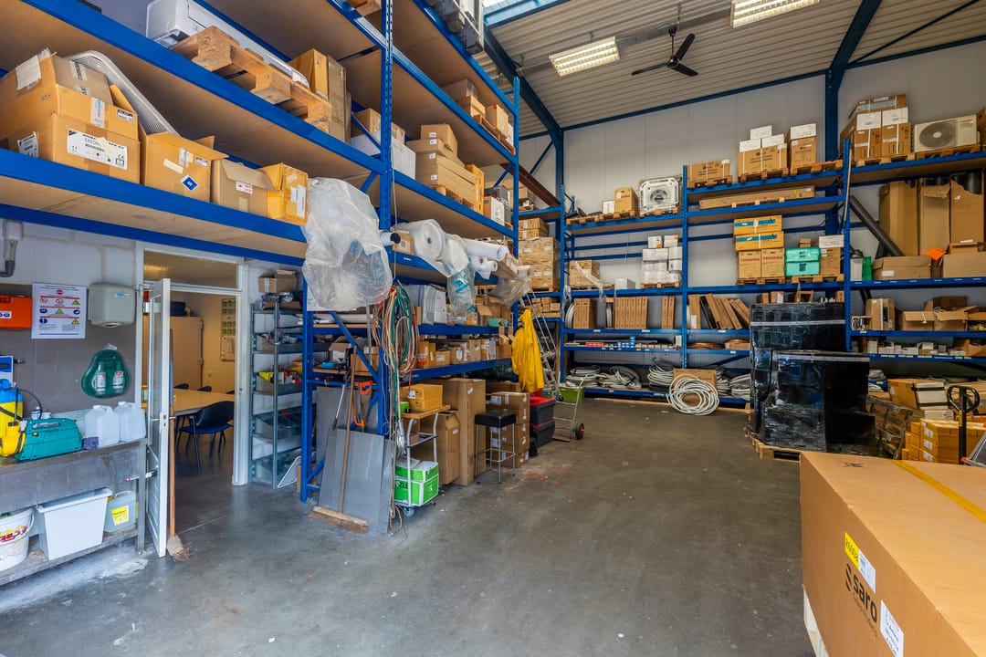 Inpandige doorgang naar de bedrijfsruimte / magazijn. Zowel aan de voor- alsook aan de achterzijde heeft de bedrijfsruimte een elektrisch bediende overheaddeur. Aan de achterzijde een royaal verhard buitenterrein, omheind en afgesloten met een inrijpoort. Vanuit de bedrijfsruimte is een trap naar een entresol t.b.v. extra opslag. De bedrijfsruimte is ook voorzien van stellingen welke eventueel kunnen achterblijven.