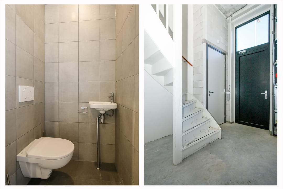 - betegelde toiletruimte met toilet en fonteintje (zowel bedrijfs- als kantoorunit);