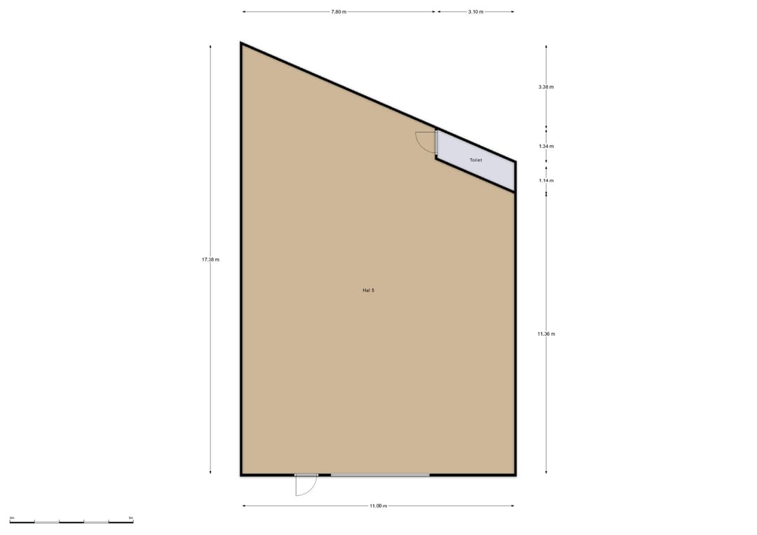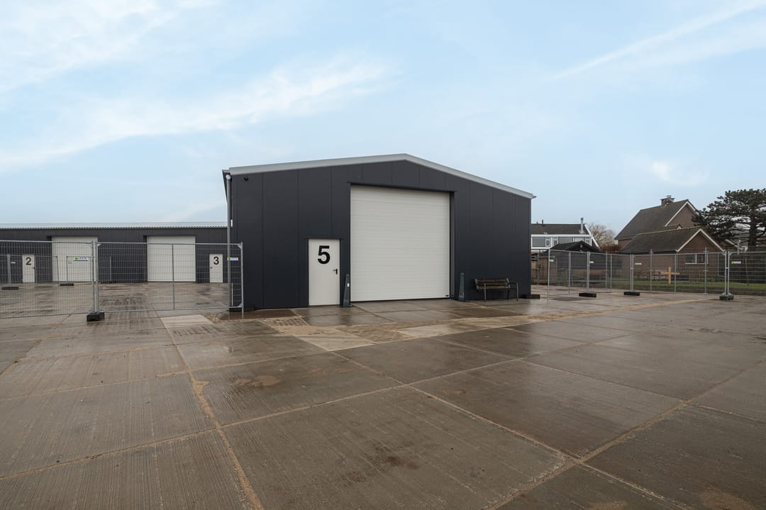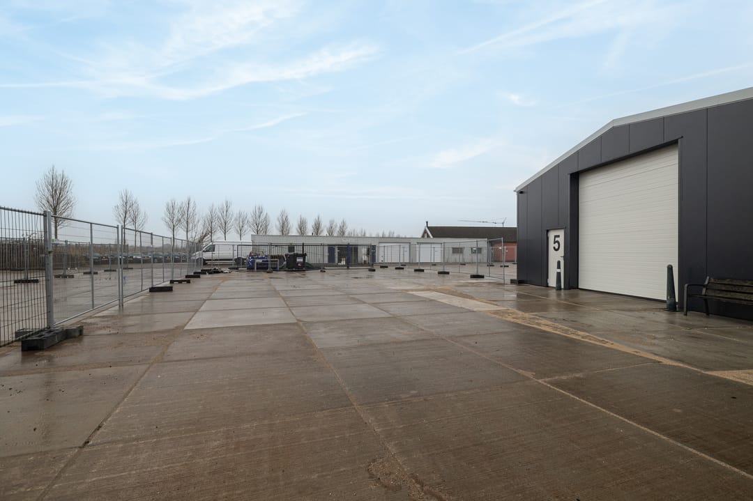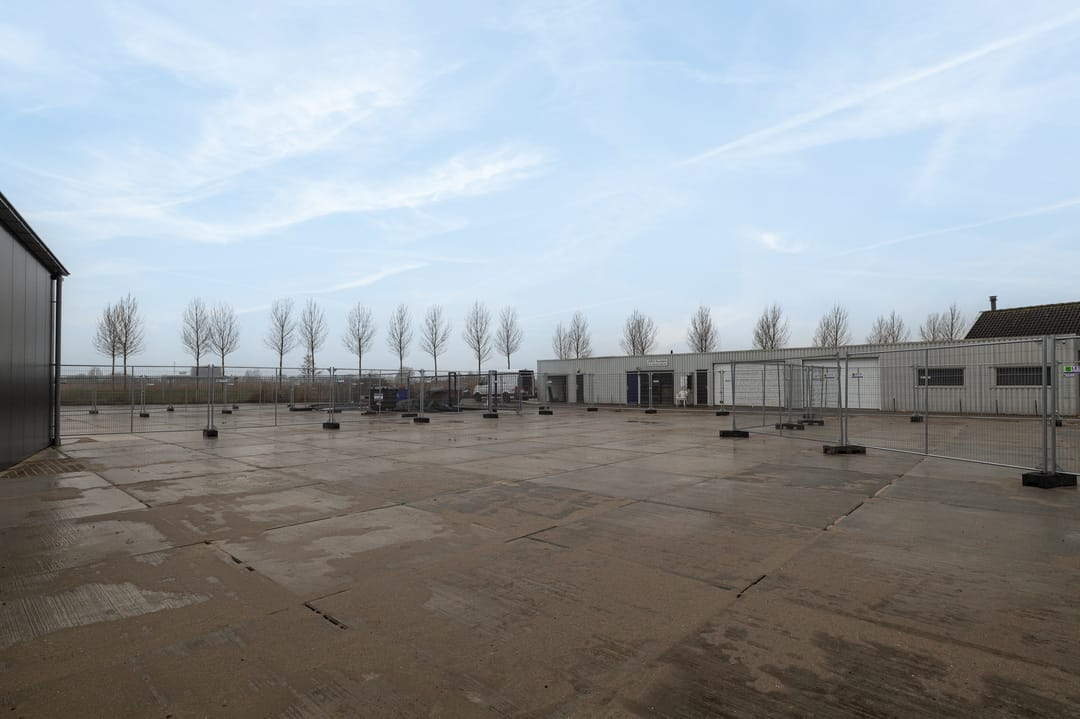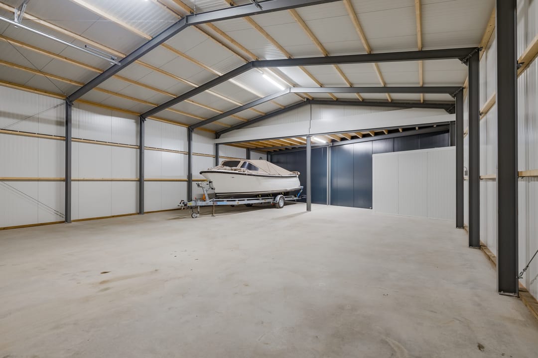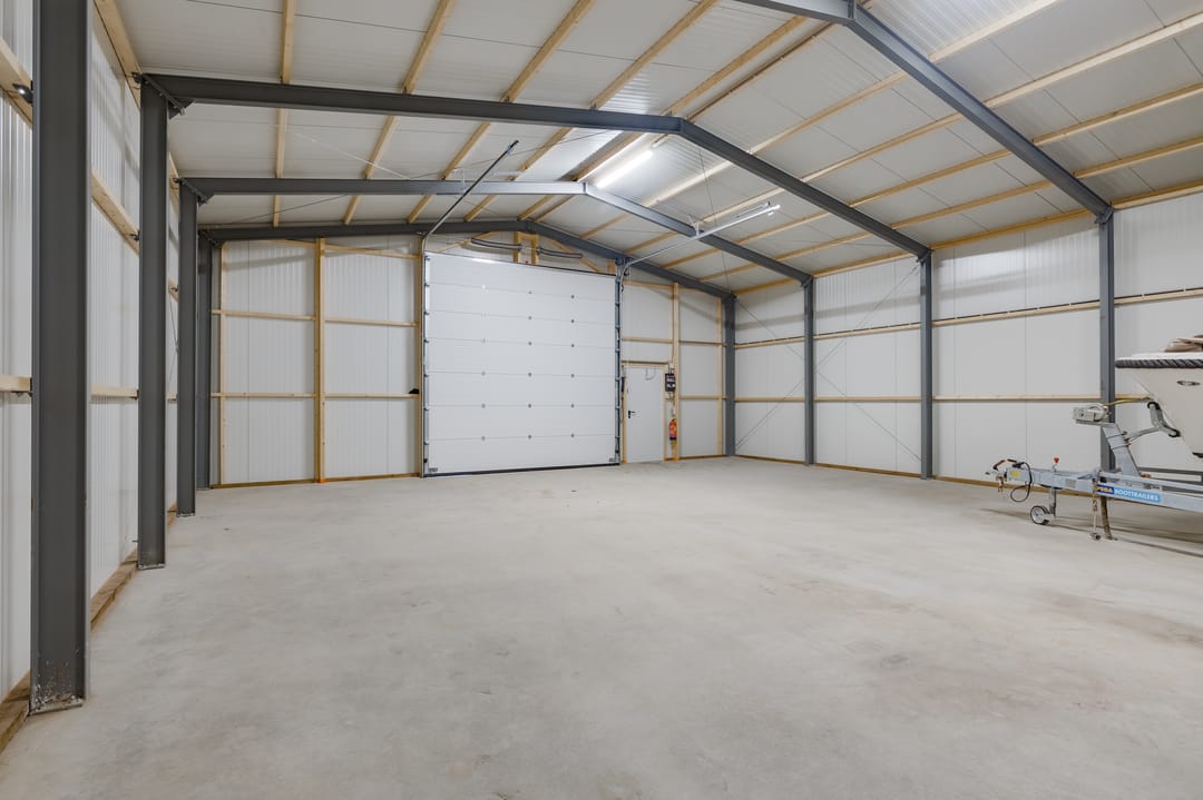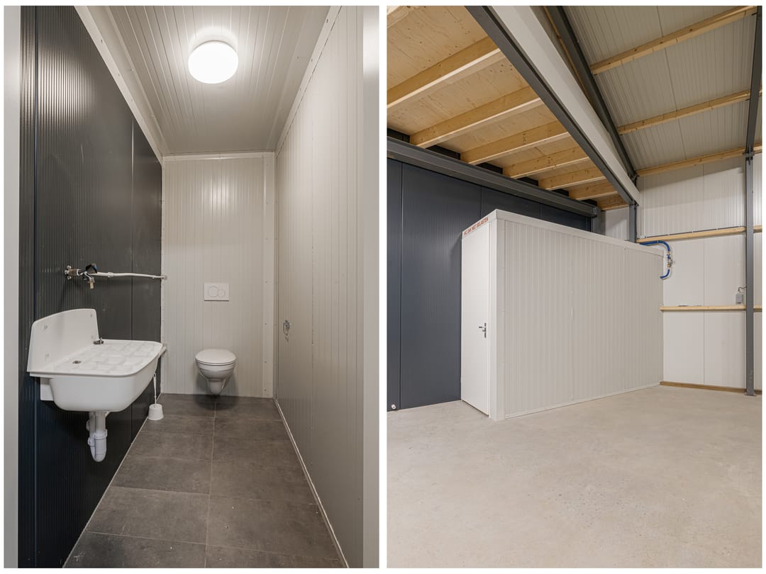 Binnenkomst via de loopdeur of de elektrische overheaddeur. De bedrijfshal is een open ruimte, rechts in de hoek tref je een toilet aan, voorzien van een uitstortgootsteen. De hal loopt aan de achterzijde schuin uit. Het hoogste punt van het puntdak meet 4,70 meter, de muren zijn 3,80 meter hoog. Het terrein aan de voorzijde van de hal is afgesloten en is voorzien van stelconplaten.