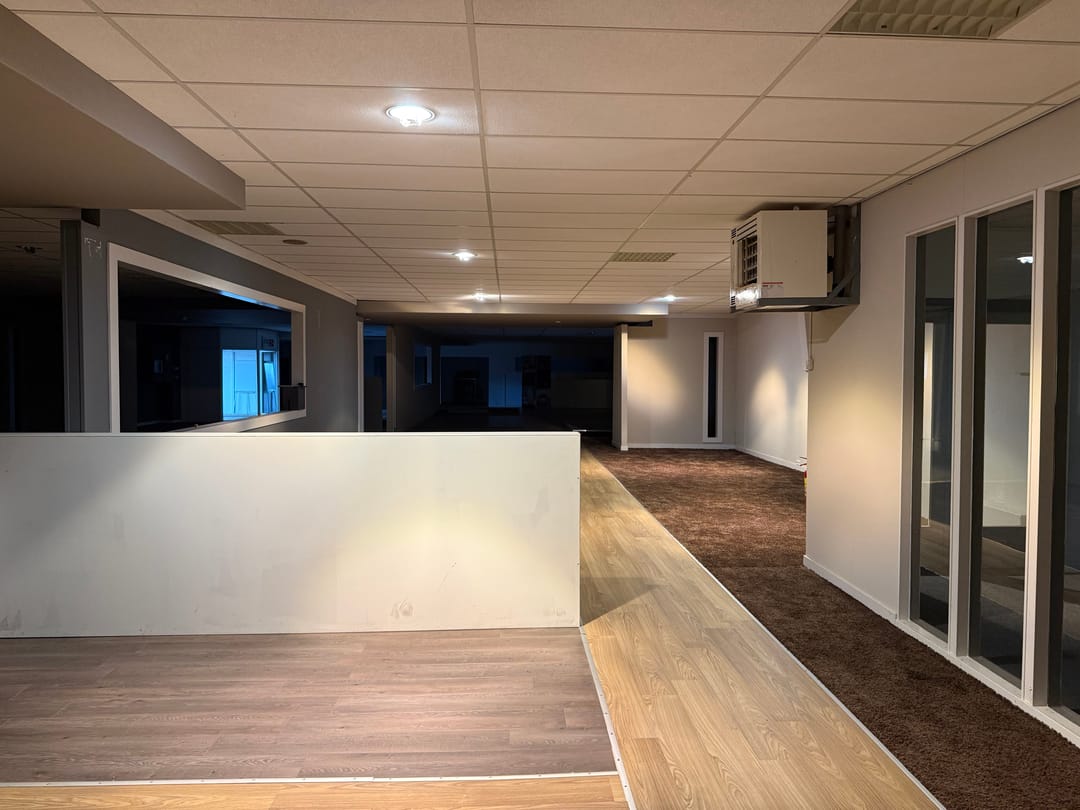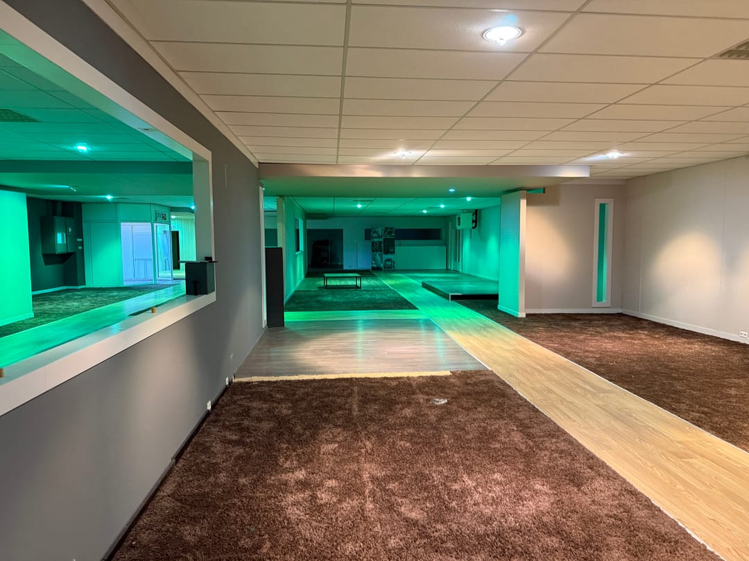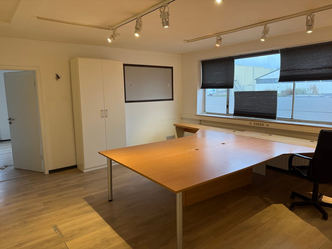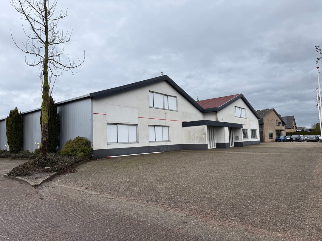 Een bedrijfsgebouw met showroomruimte verdeeld over twee bouwlagen.