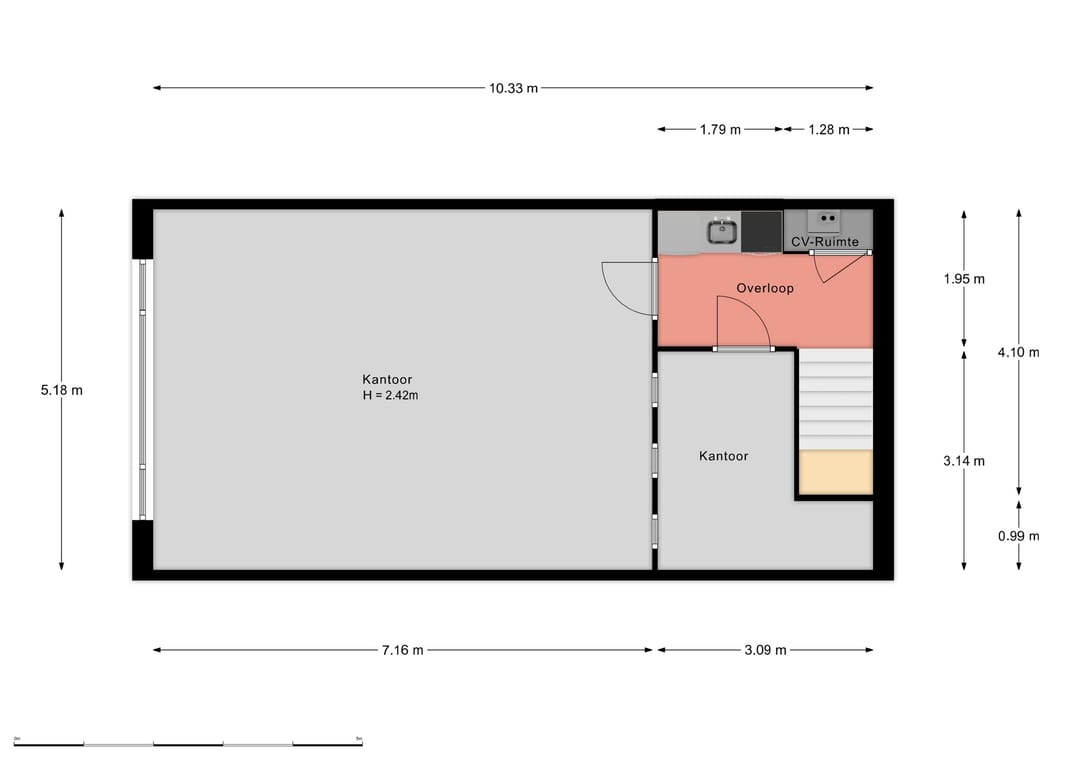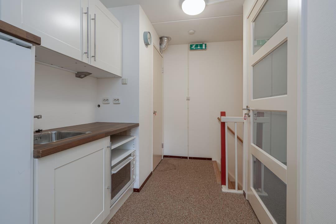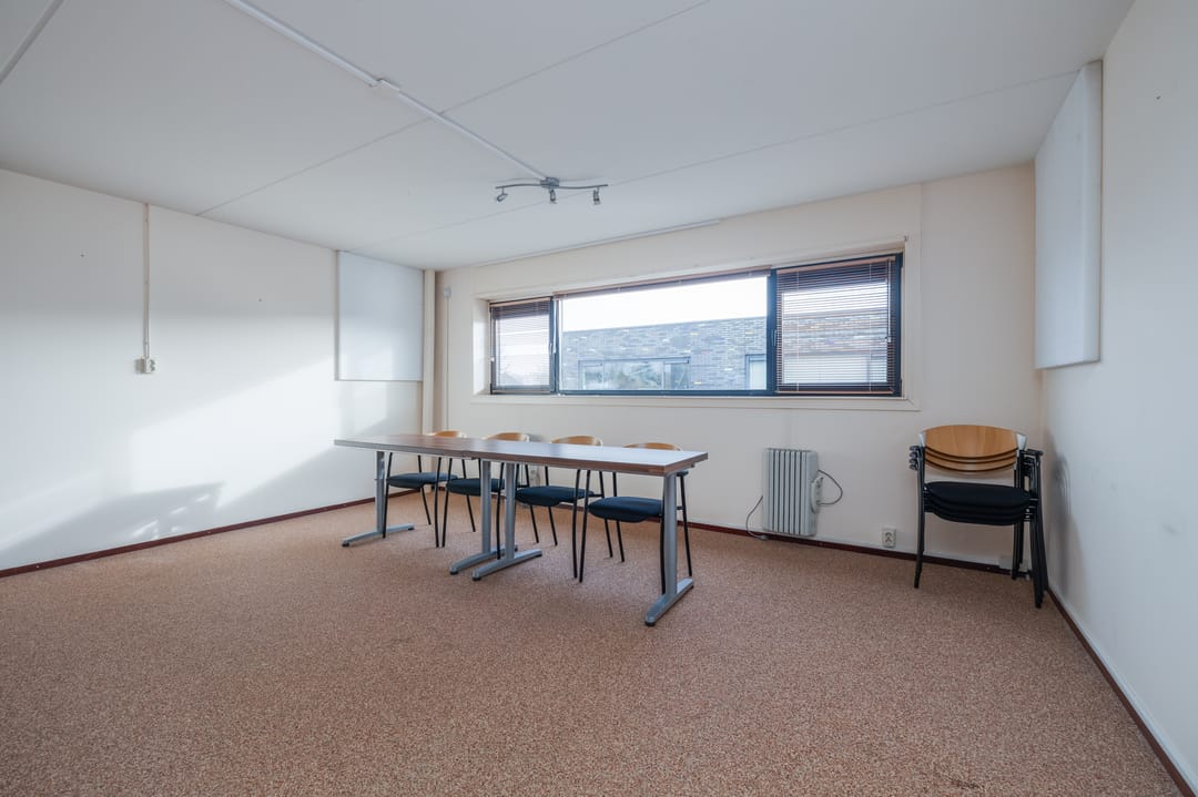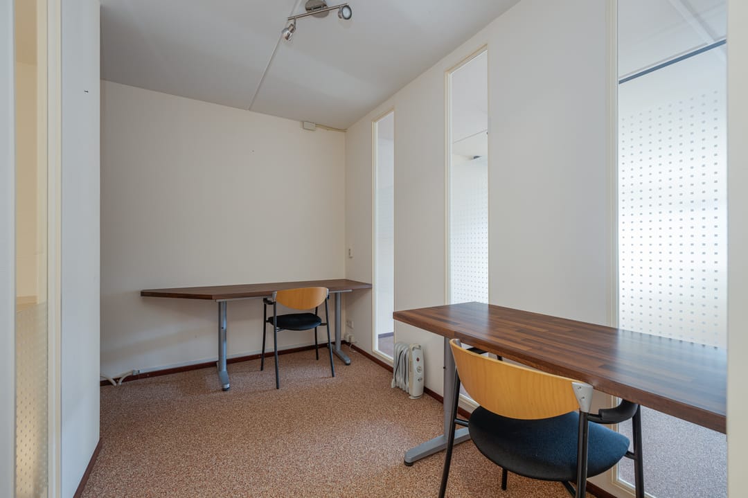 Op de eerste verdieping vind je twee comfortabele kantoorruimtes en een handige pantry. Dankzij de grote raampartij aan de voorzijde geniet je van een opvallend lichte en inspirerende werkomgeving. De grindvloer vloer geeft de verdieping een moderne look die perfect past bij de creatieve sector.
