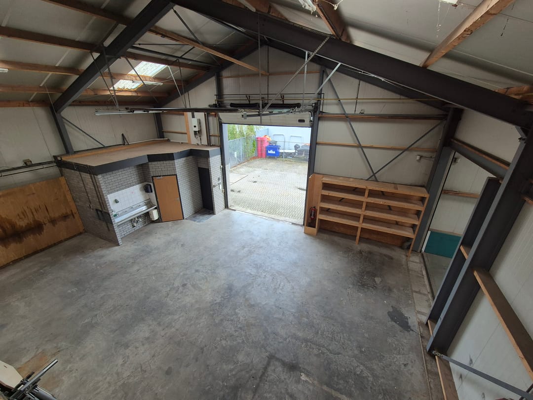 Bedrijfshal 1 met entree, toiletruimte en doorgang naar de kantoorruimte. Bedrijfsruimte met wasbak, krachtstroom, elektrisch bedienbare overheaddeur (4,45 x 4 m¹) en een entresolvloer met CV opstelling. Middels een schuifdeur is bedrijfshal 2 te bereiken.