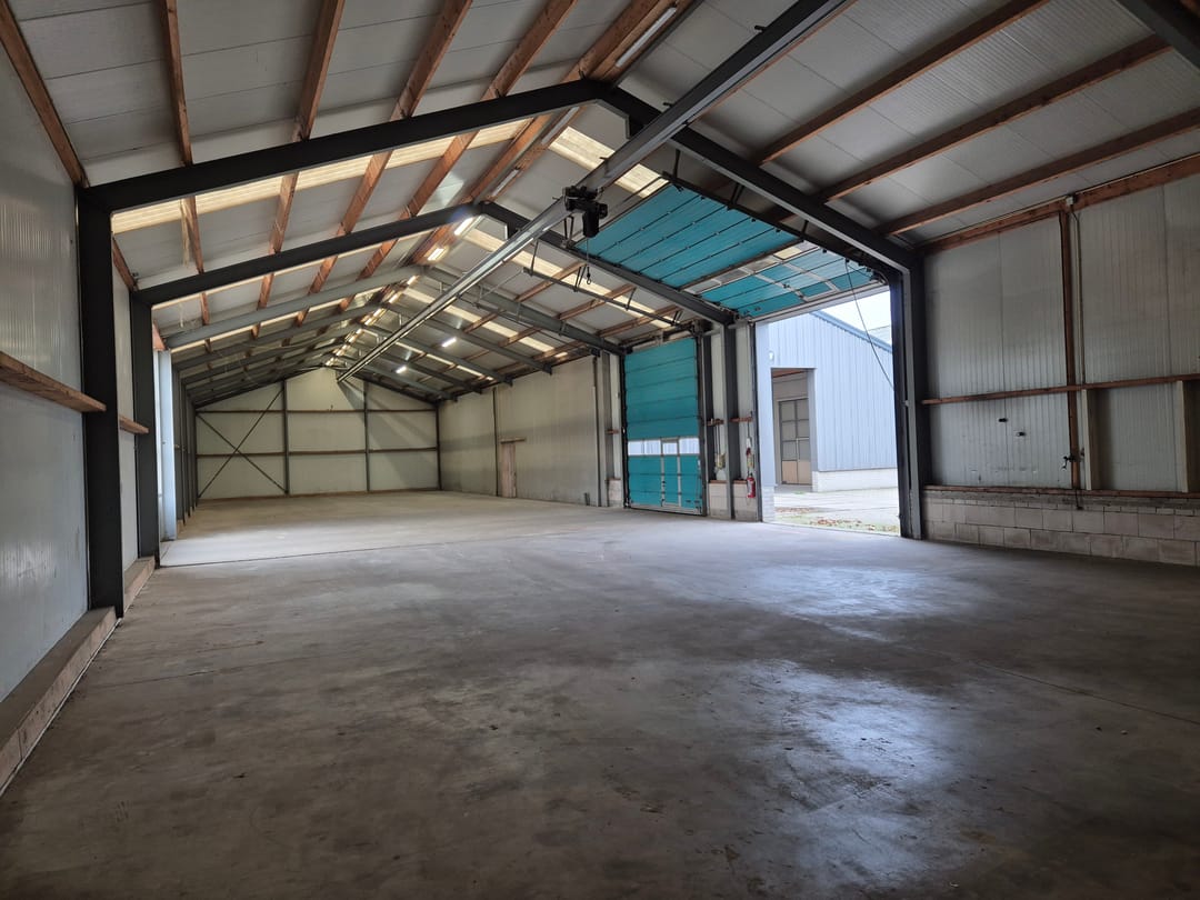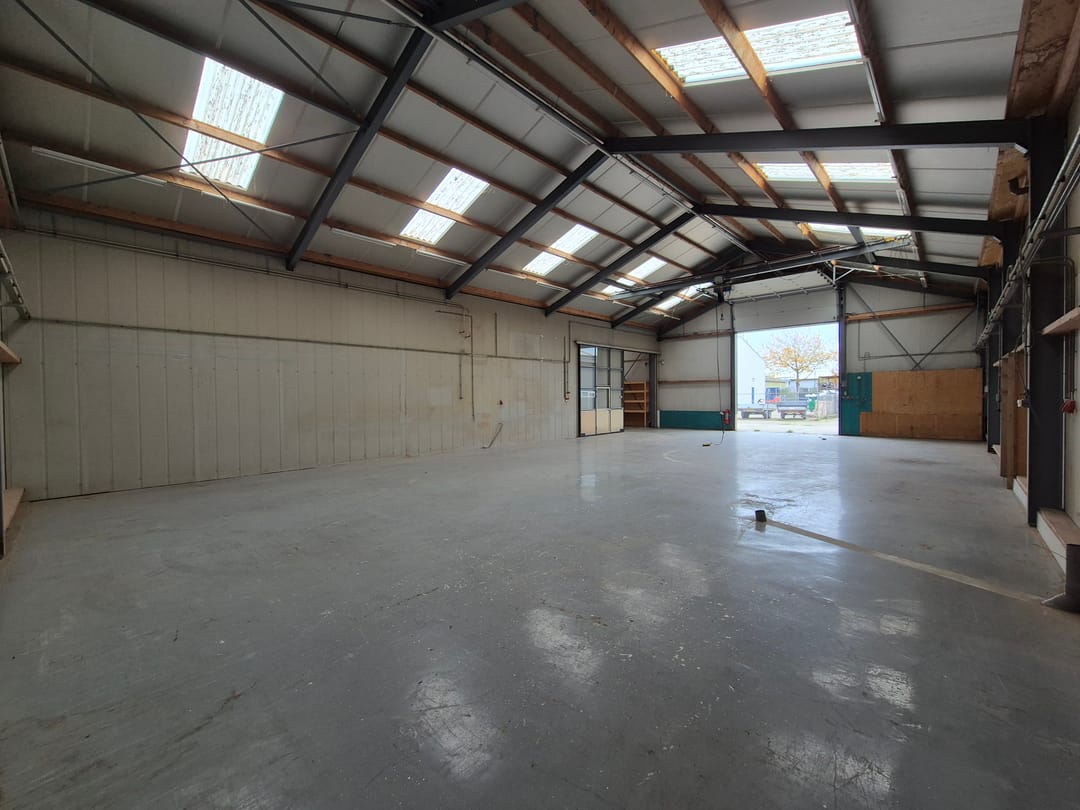 Bedrijfshal 3 met krachtstroom en 2 elektrisch bedienbare overheaddeuren (4,45 x 4 m¹) aan de voorzijde. Het achtergelegen terrein is bereikbaar middels 2 schuifdeuren en een handmatig bedienbare overheaddeur ( 4 x 4 m¹).