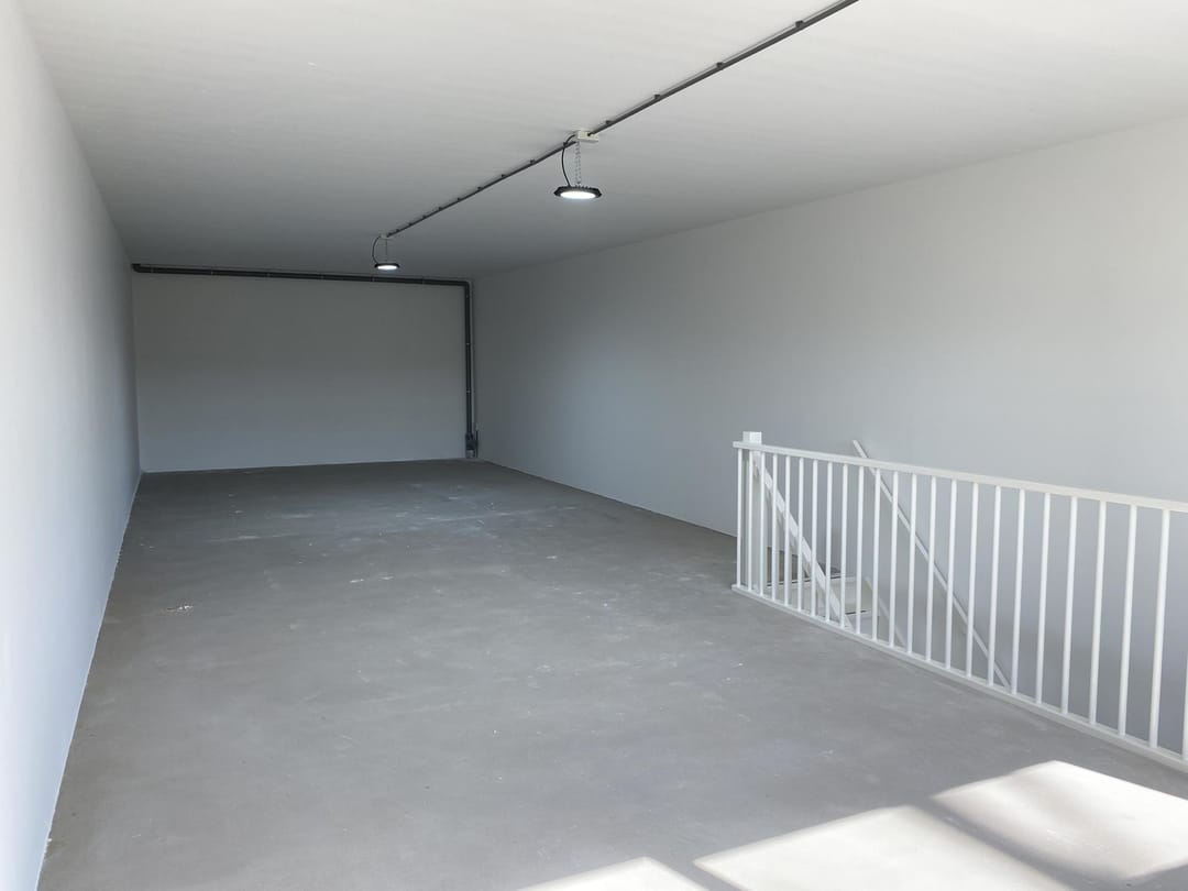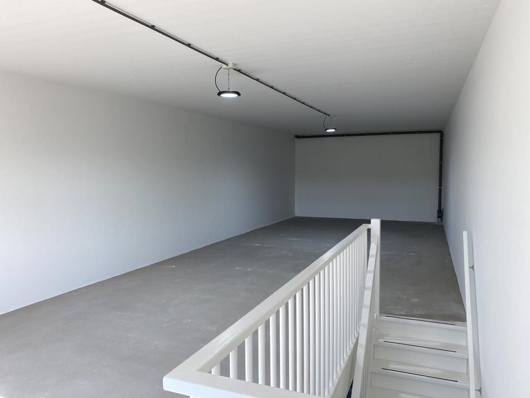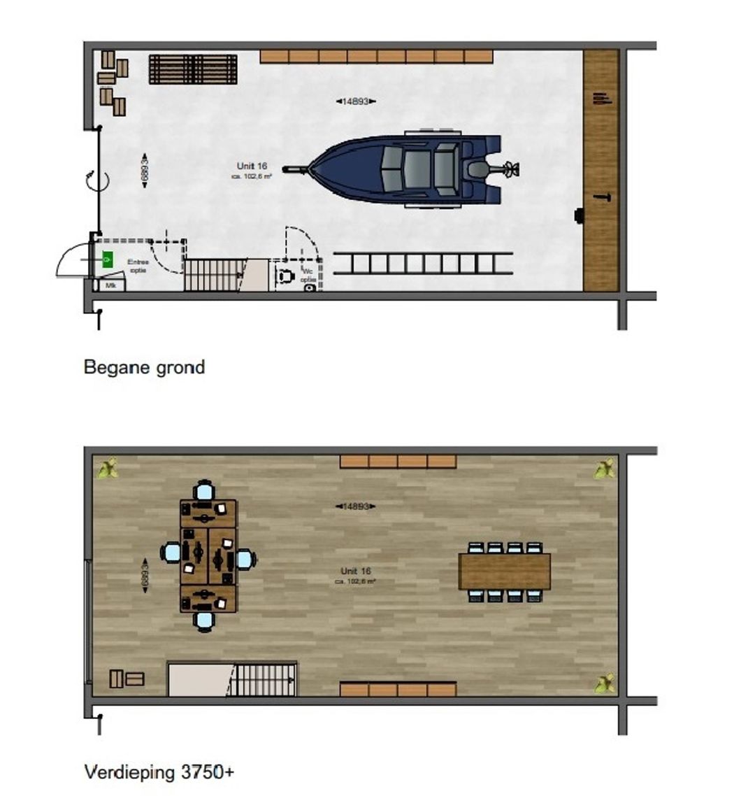 De begane grondvloer bestaat uit een monoliet afgewerkte betonvloer, en opgenomen onder de betonvloer een 10 cm. dikte schuimbeton. Nuttige vloerbelasting max. 1.500 kg per m². Vrije hoogte begane grond: 3,75 meter. De overheaddeuren zijn uitgevoerd als een geïsoleerde sectionaaldeur. Op de begane grond de meterkast, een toiletgroep en de trap naar de eerste verdieping.