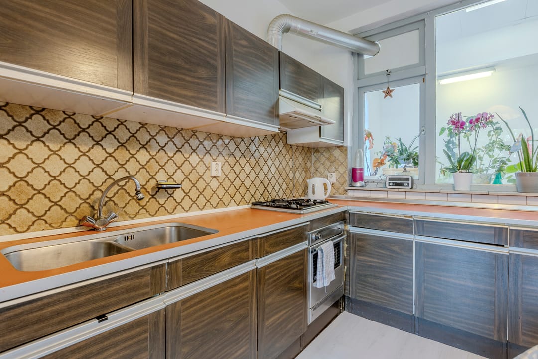 Woonkeuken voorzien van kraan, dubbele spoelbak, koelkast, 4-pits gaskookstel, oven, afzuigkap, bergkasten.