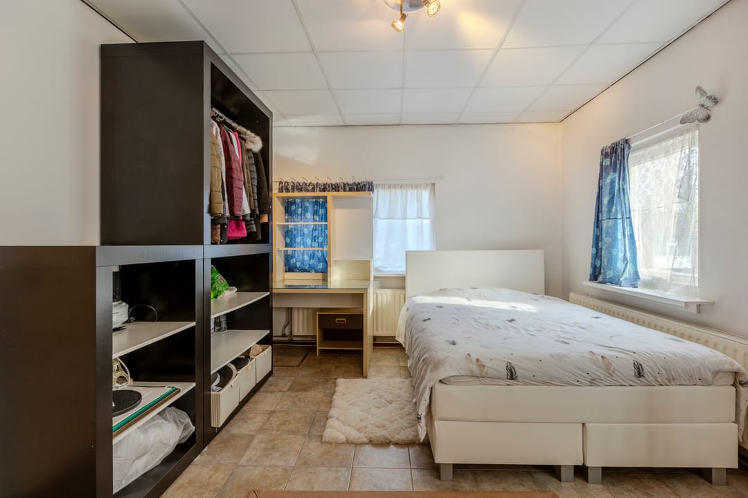Ruime slaapkamer (ca. 3.46m x 4.93m) met toegang tot het dak.