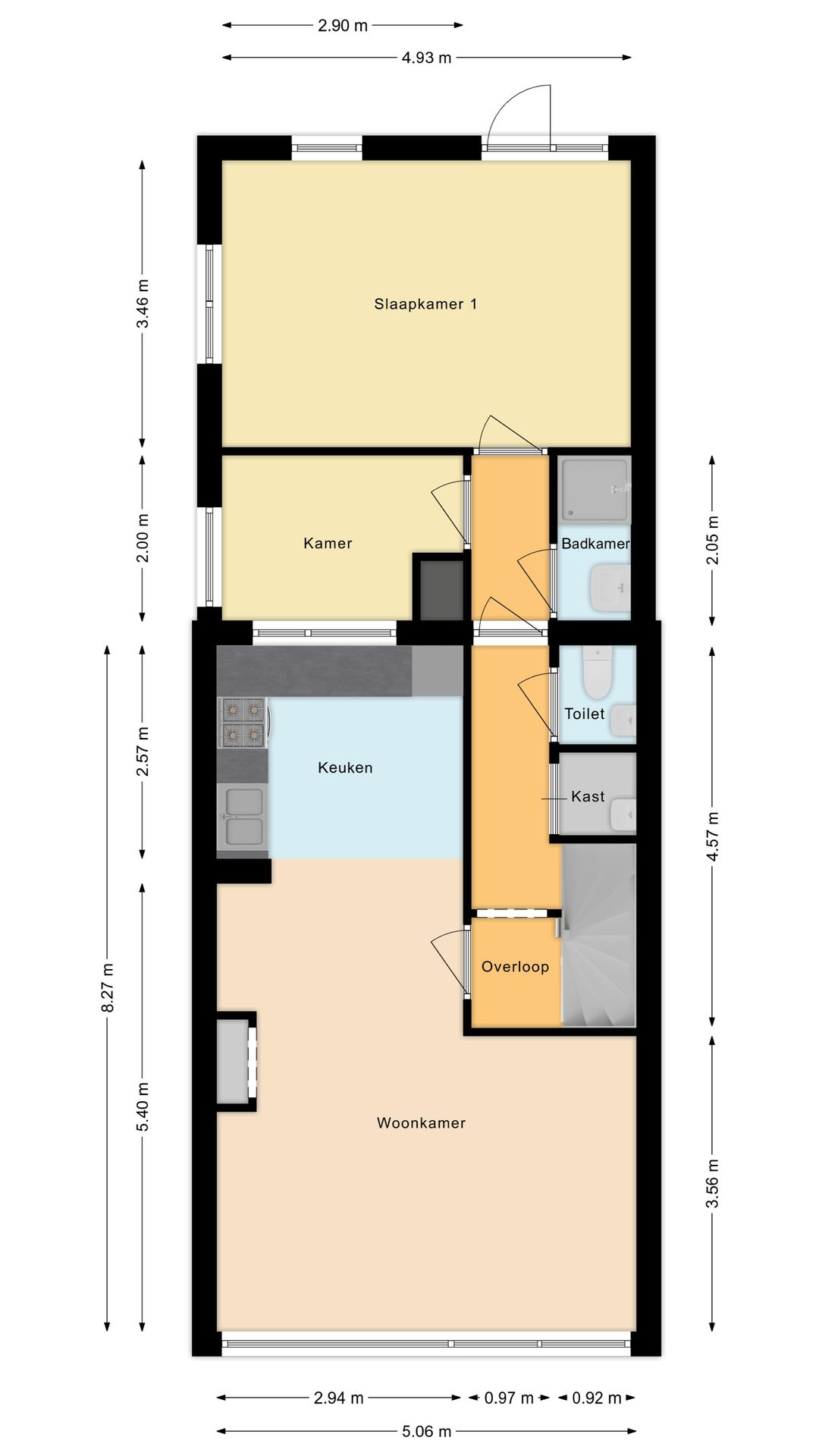 - keuken voorzien van kraan, spoelbak, afzuigkap, boven- en onderkasten.