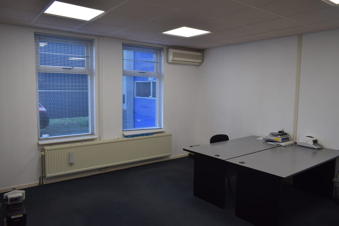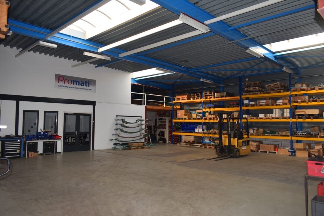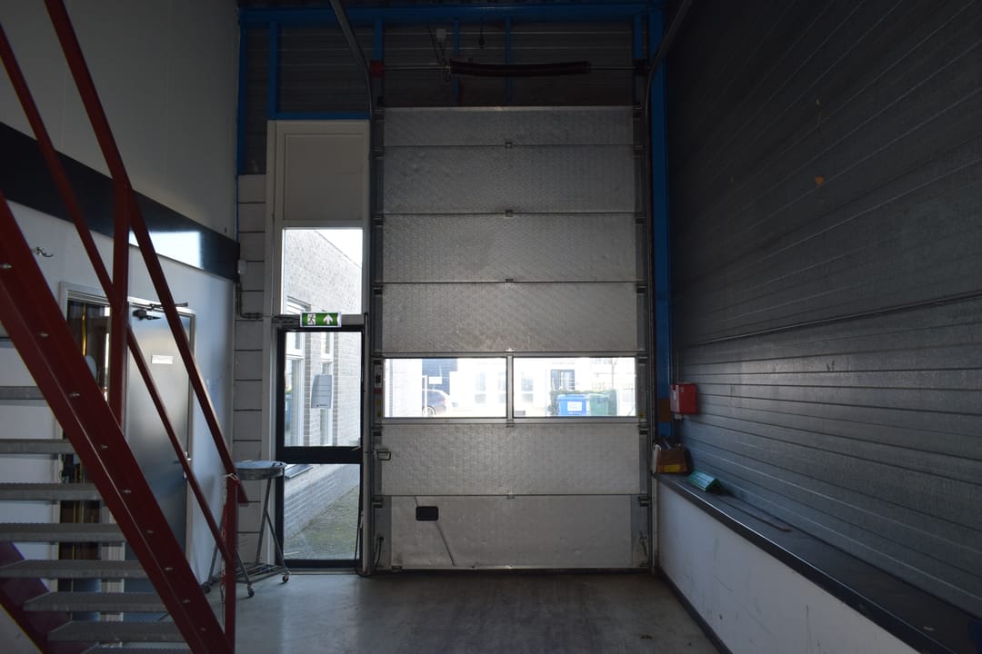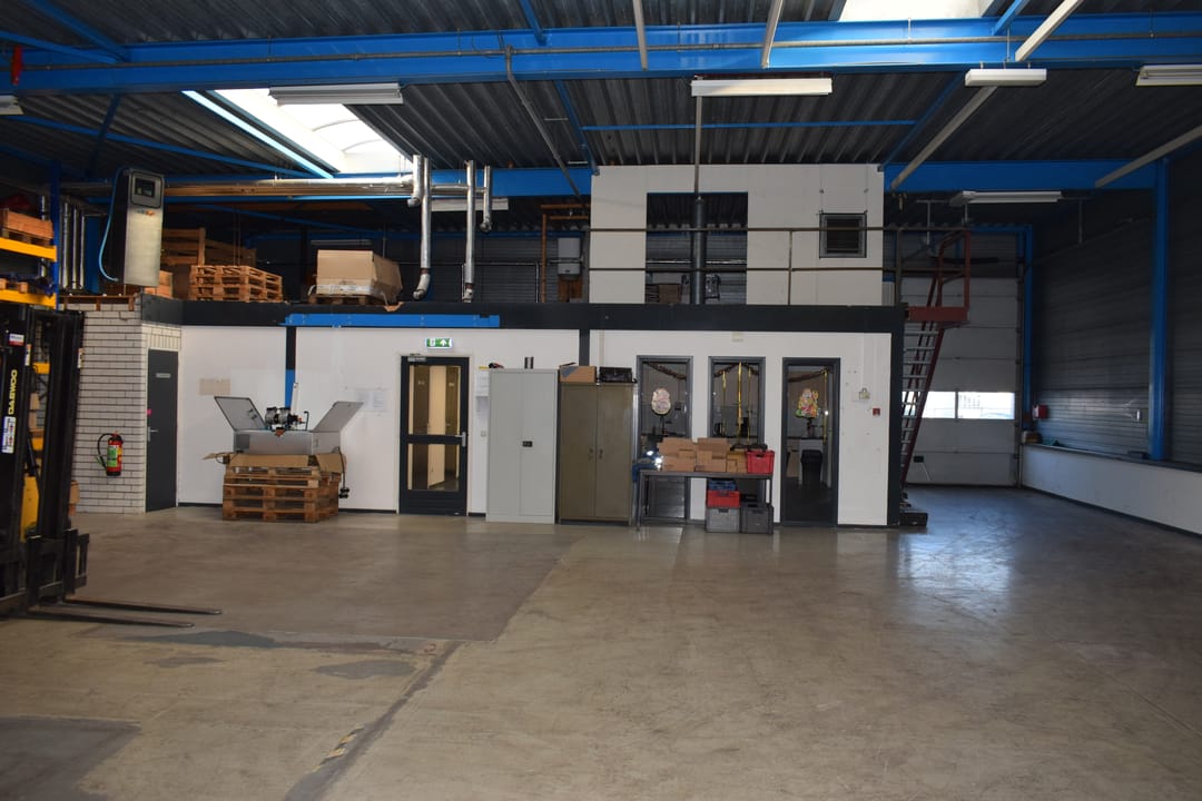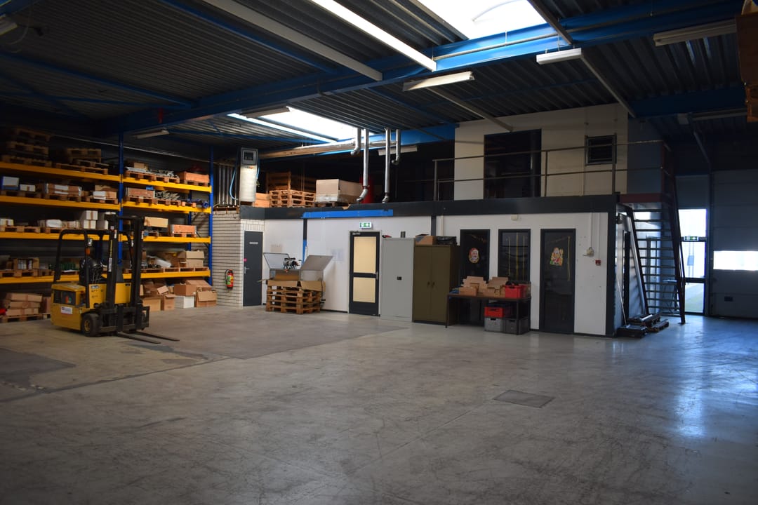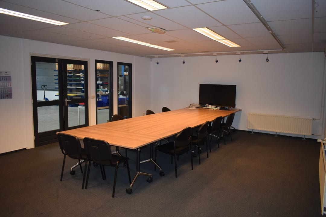 Bedrijfshal met overheaddeur met een vrije hoogte van circa 5 meter. Aan de achterzijde van de hal is een conferentie/presentatieruimte gerealiseerd. Middels een vast trap is de entresol te bereiken ten behoeve van opslag.