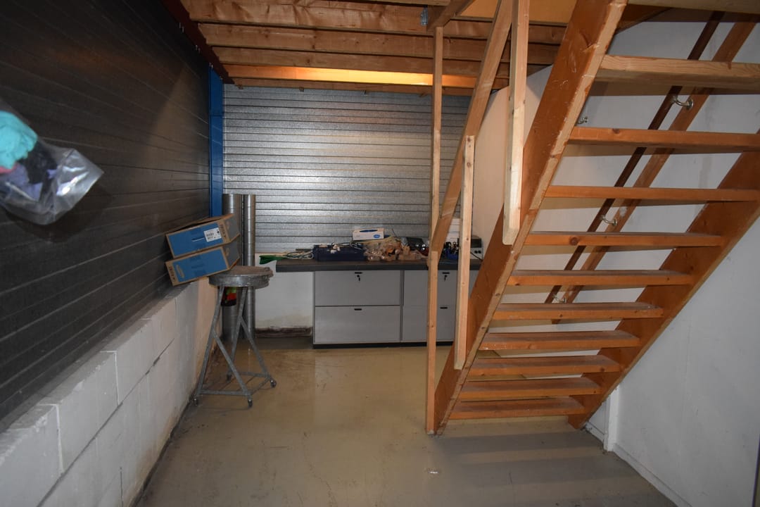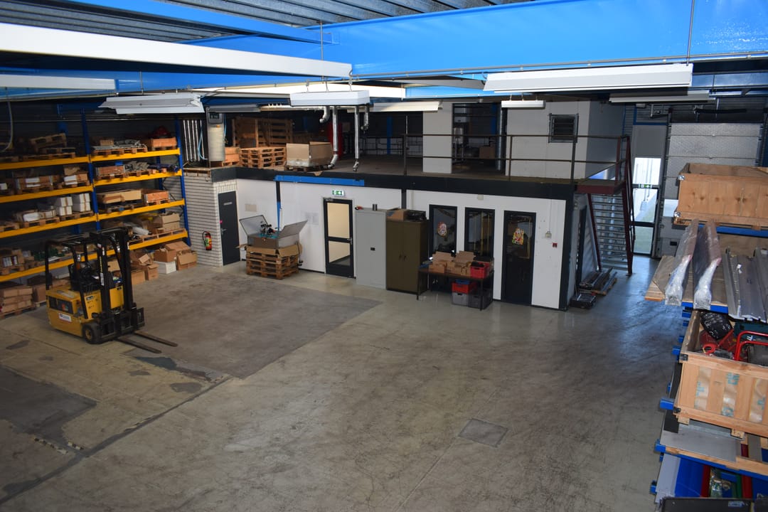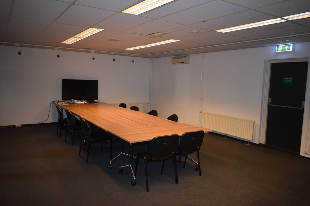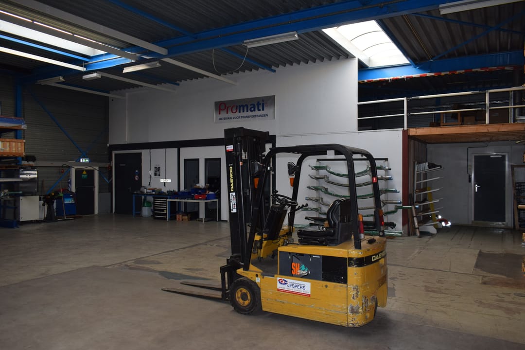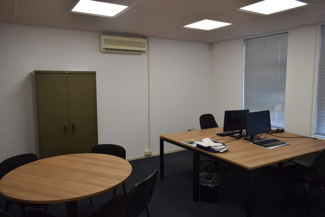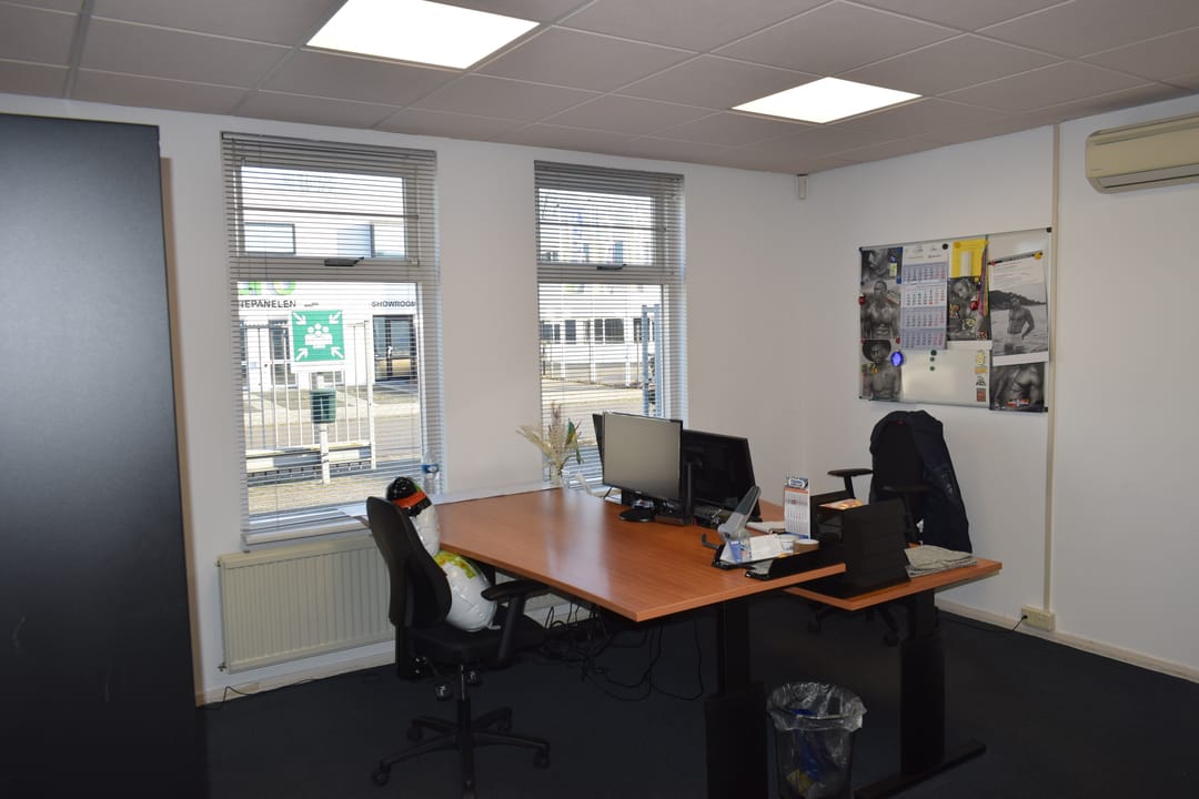 Bedrijfshal met overheaddeur met een vrije hoogte van circa 5 meter. Aan de achterzijde van de hal is een conferentie/presentatieruimte gerealiseerd. Middels een vast trap is de entresol te bereiken ten behoeve van opslag.