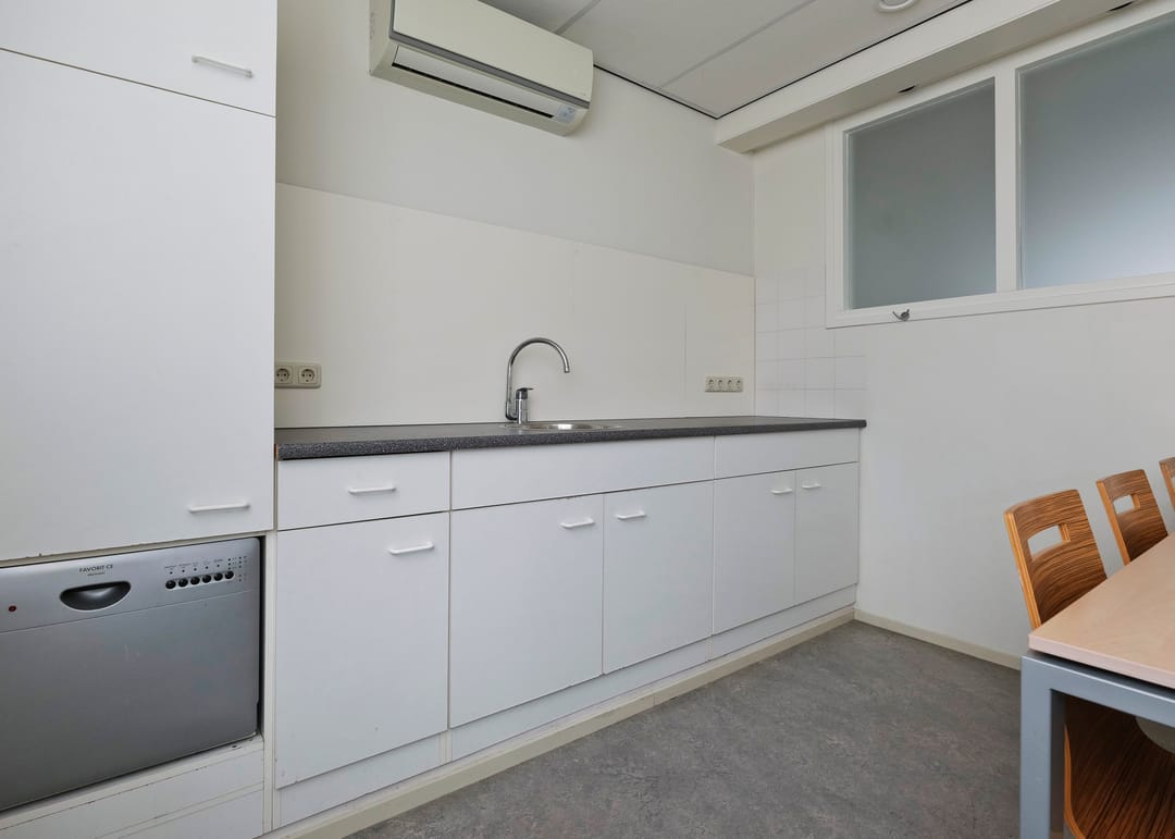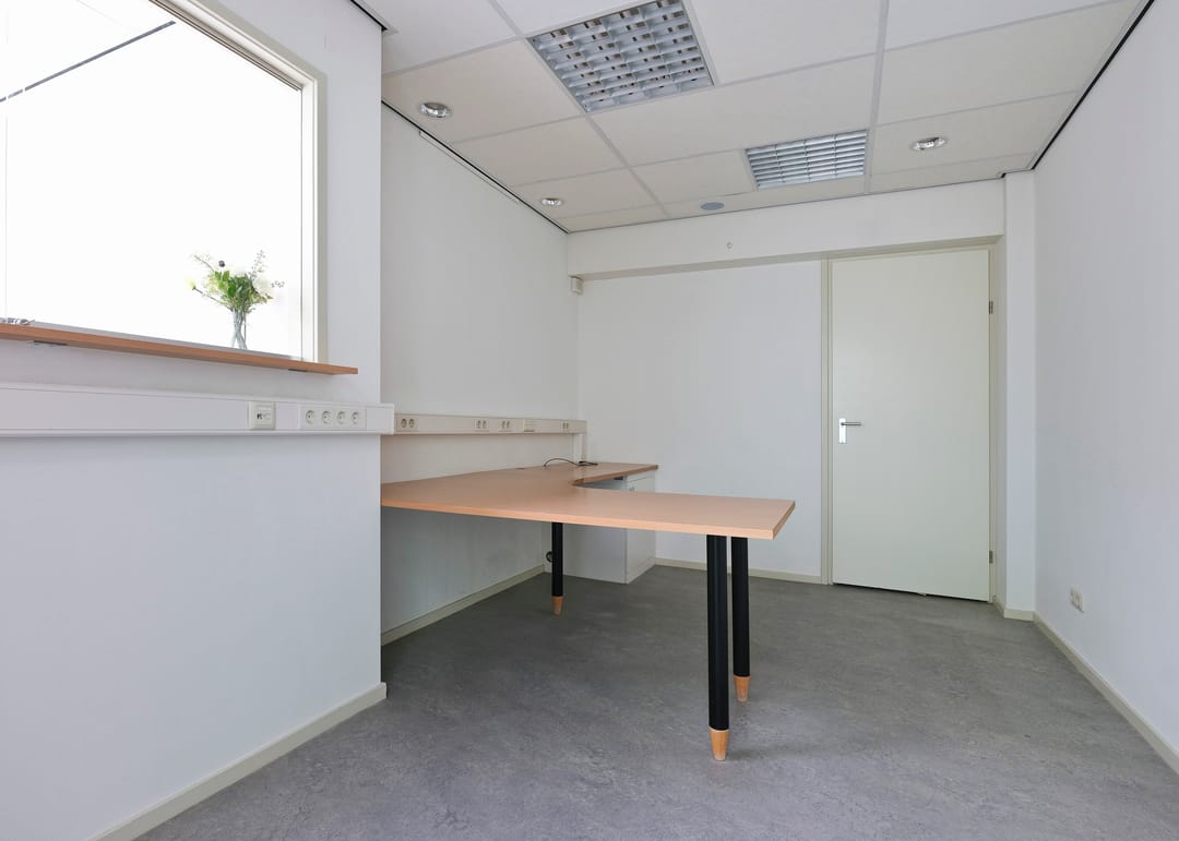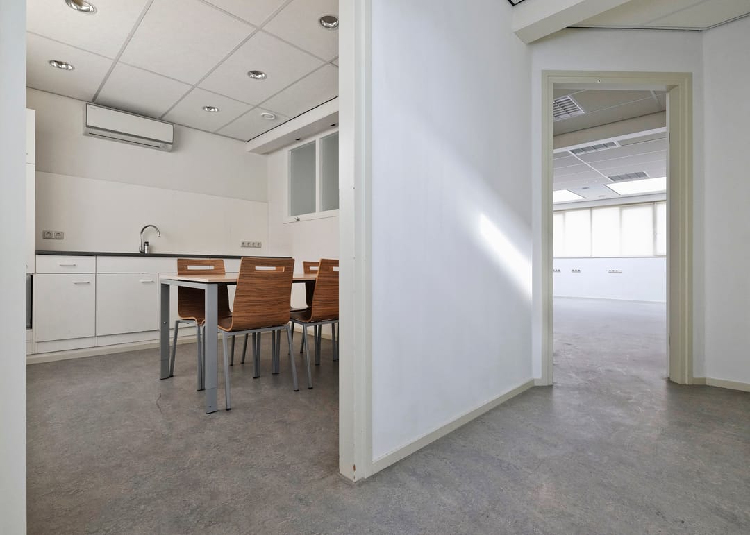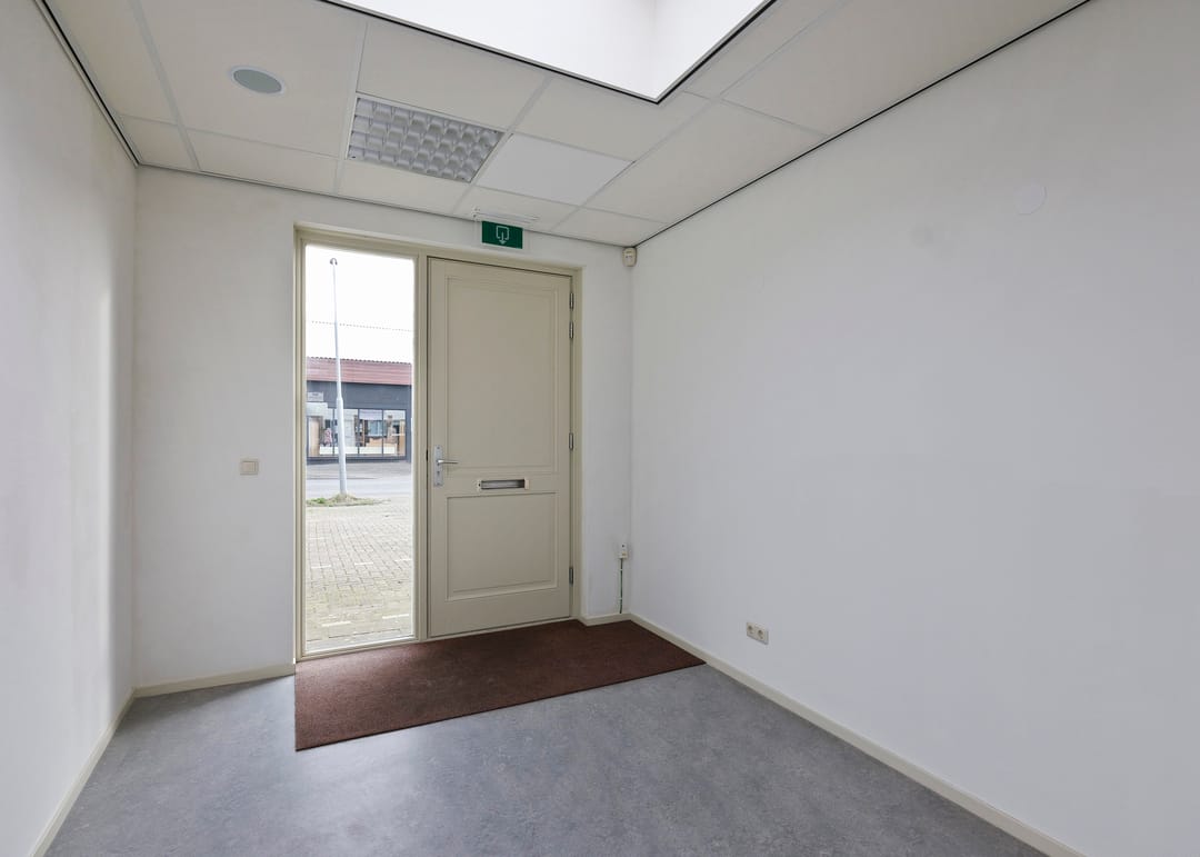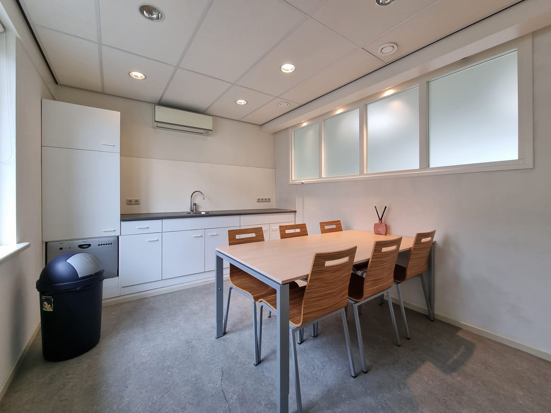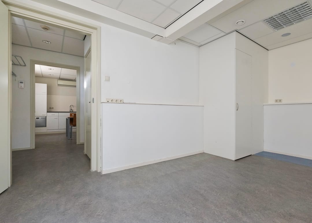 Entree/hal, receptie met vaste kast, werkruimte, keukenruimte met pantryblok, voorzien van spoelbak, koelkast en vaatwasser, zijentree met meterkast, toiletruimte en toegang tot 2 werkruimtes (waarvan 1 met vaste kast).