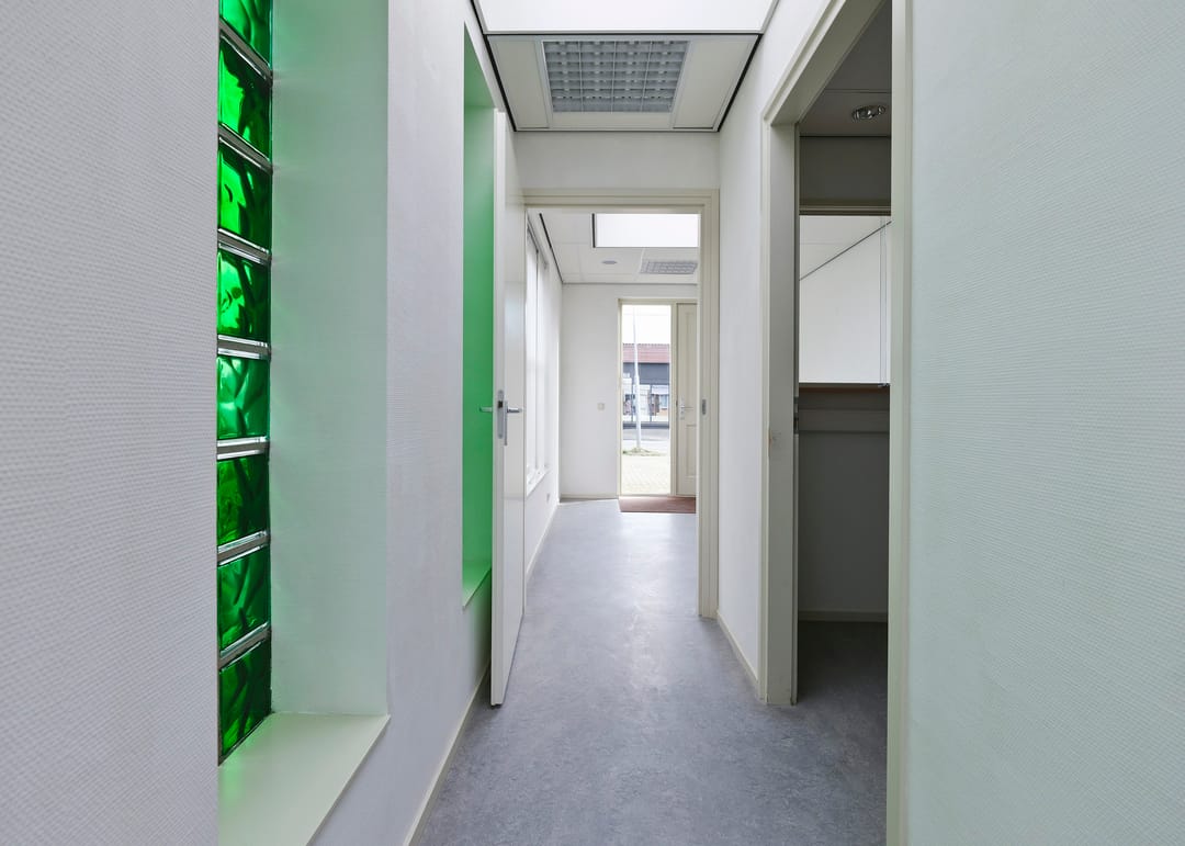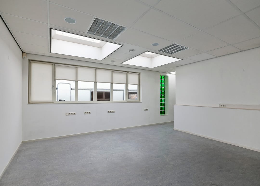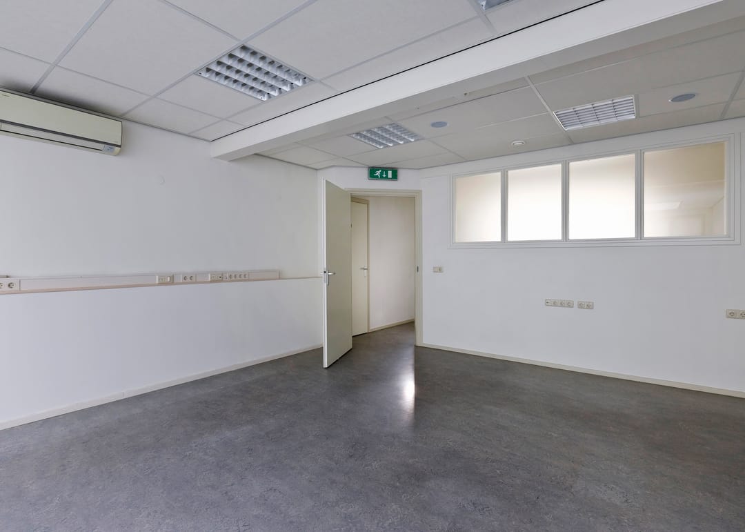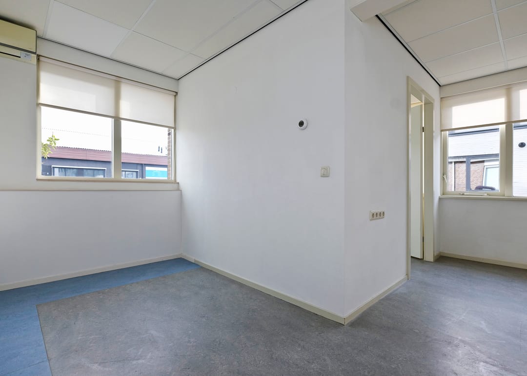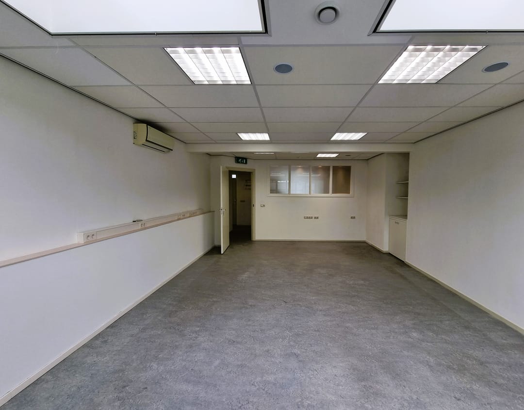 Entree/hal, receptie met vaste kast, werkruimte, keukenruimte met pantryblok, voorzien van spoelbak, koelkast en vaatwasser, zijentree met meterkast, toiletruimte en toegang tot 2 werkruimtes (waarvan 1 met vaste kast).