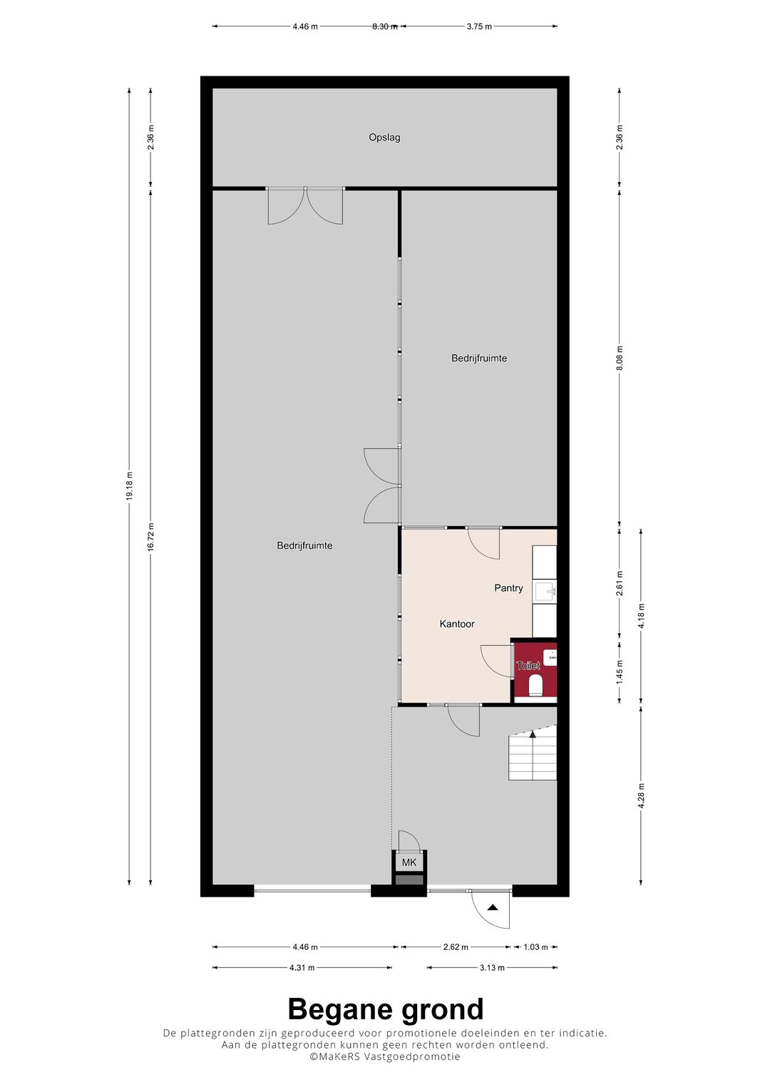 De begane grond beschikt over een overheaddeur, een monoliet afgewerkte staalvezelvloer met hoge belastbaarheid en praktische voorzieningen zoals verwarming, krachtstroom, verlichting, een toiletruimte en een pantry met keukenblok en kantine/1e kantoor. Er is verder een eigen meterkast met eigen meters aanwezig, alsmede internet en een alarmsysteem.
