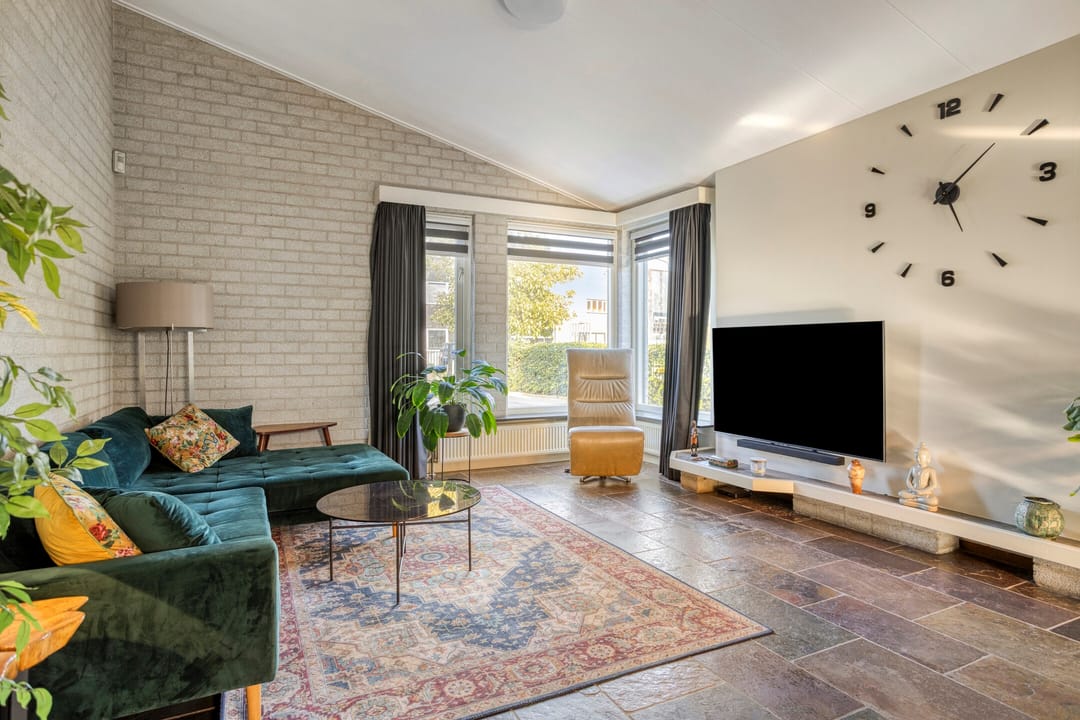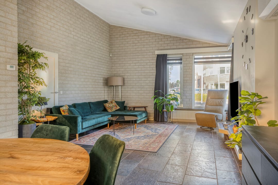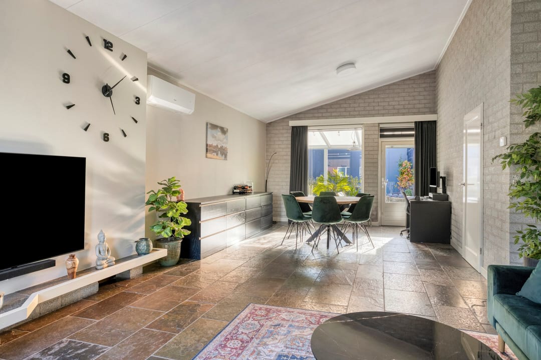 De woonkamer heeft ook een leisteen tegelvloer met vloerverwarming, MBI- en stucwerk wanden en een schuinoplopend gipsplaten plafond. Voorzien van een wandairco en veel daglicht middels diverse hardhouten raamkozijnen met dubbele beglazing. Aan de achterzijde middels een hardhouten terrasdeur toegang tot een overdekt terras.