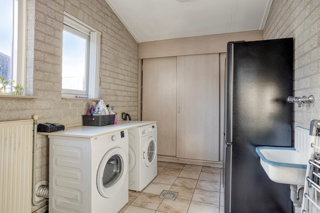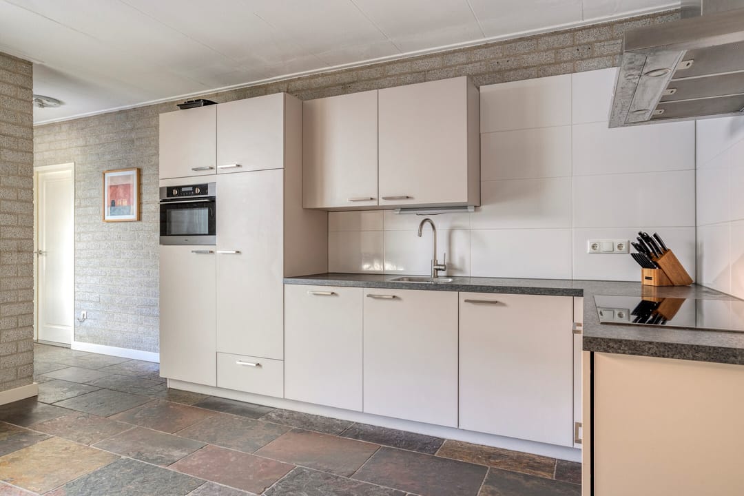 Vanuit de woonkamer met een deur naar de eetkeuken welke ook bereikbaar is vanuit de hal. Ook de keuken heeft een leisteen tegelvloer met vloerverwarming, MBI wanden en een gipsplaten plafond. De lichte keukeninrichting in een hoekopstelling is voorzien van een inductiekookplaat, een RVS afzuigkap, een vaatwasser, een koelkast en een combimagnetron. Vanuit de keuken naar de bijkeuken en het overdekt terras. De Bijkeuken heeft een tegelvloer met vloerverwarming, MBI wanden en een gipsplaten plafond. Hier bevindt zich de aansluiting voor de wasapparatuur, een uitstortgootsteen en een vaste kastenwand met daarachter o.a. de Remeha Quinta HR combiketel (2008), de Bosch boiler (2024 / ± 100 liter) en de unit van de vloerverwarming (3 groepen).