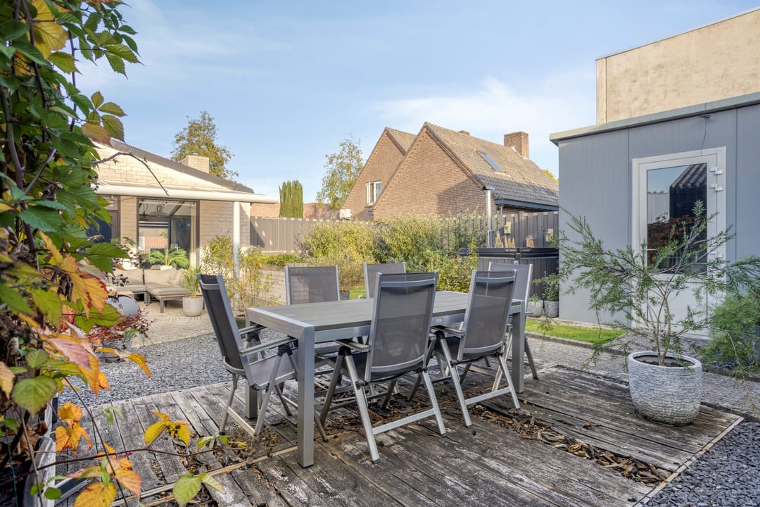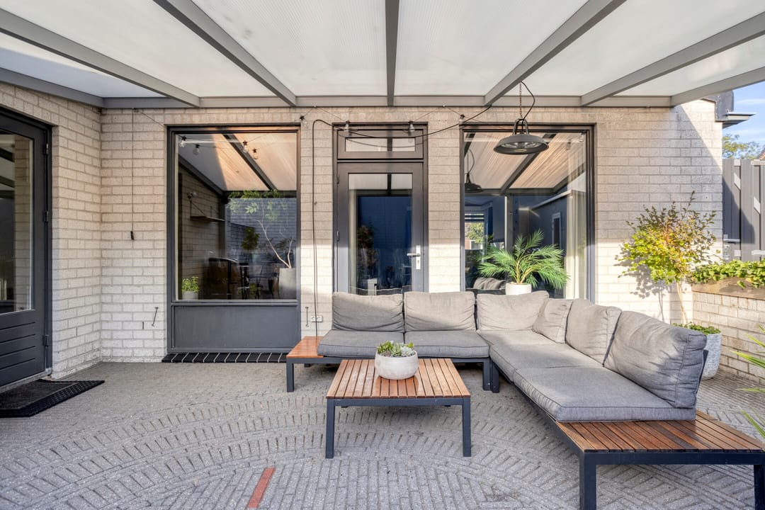 Direct aan de woning bevindt zich een overdekt terras, uitgevoerd in aluminium met polycarbonaat dakplaten. Met o.a. een gazon, aangeplante borders en een berging. Aan de linkerzijde van de woning via een poort toegang tot de oprit en aan de rechterzijde via een poort toegang tot de grote oprit en de bedrijfsruimte. Deze grote oprit is vanuit de openbare weg bereikbaar middels een afsluitbare, op afstand te bedienen elektrische poort.