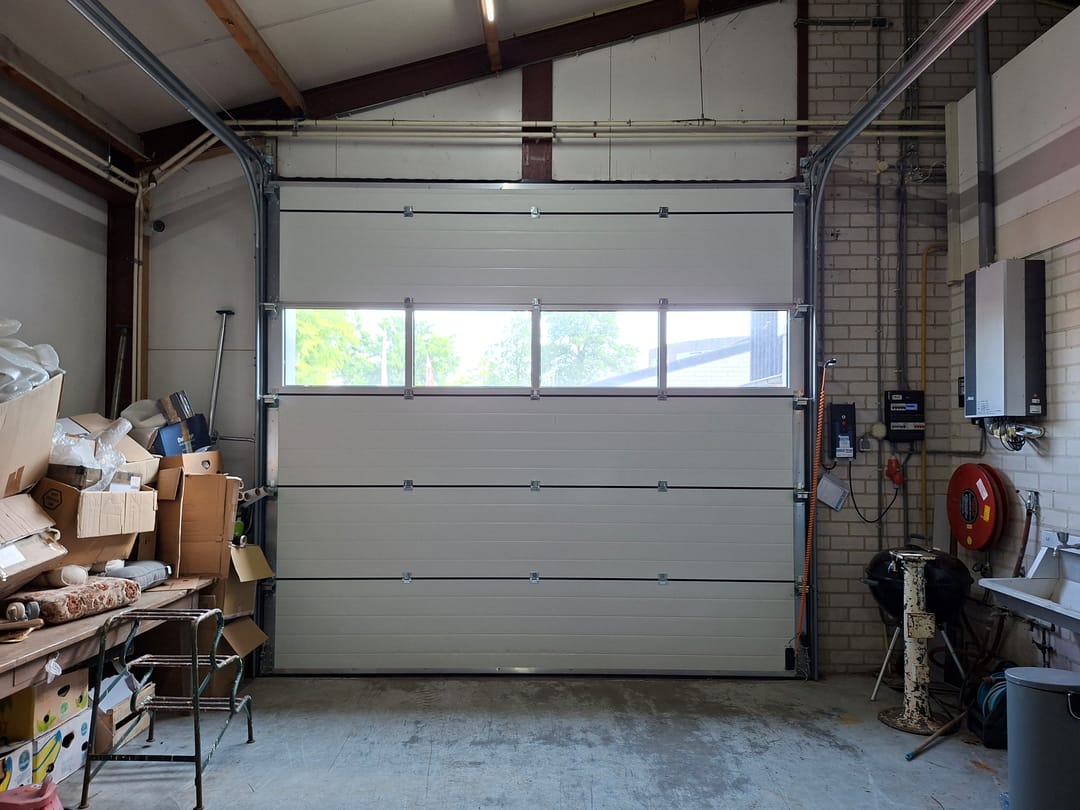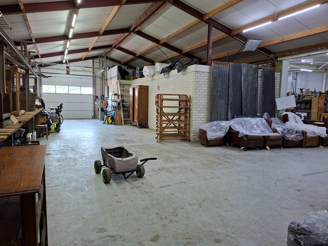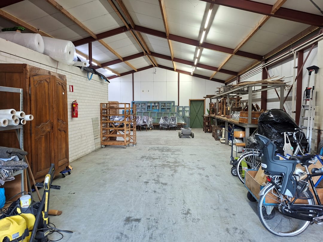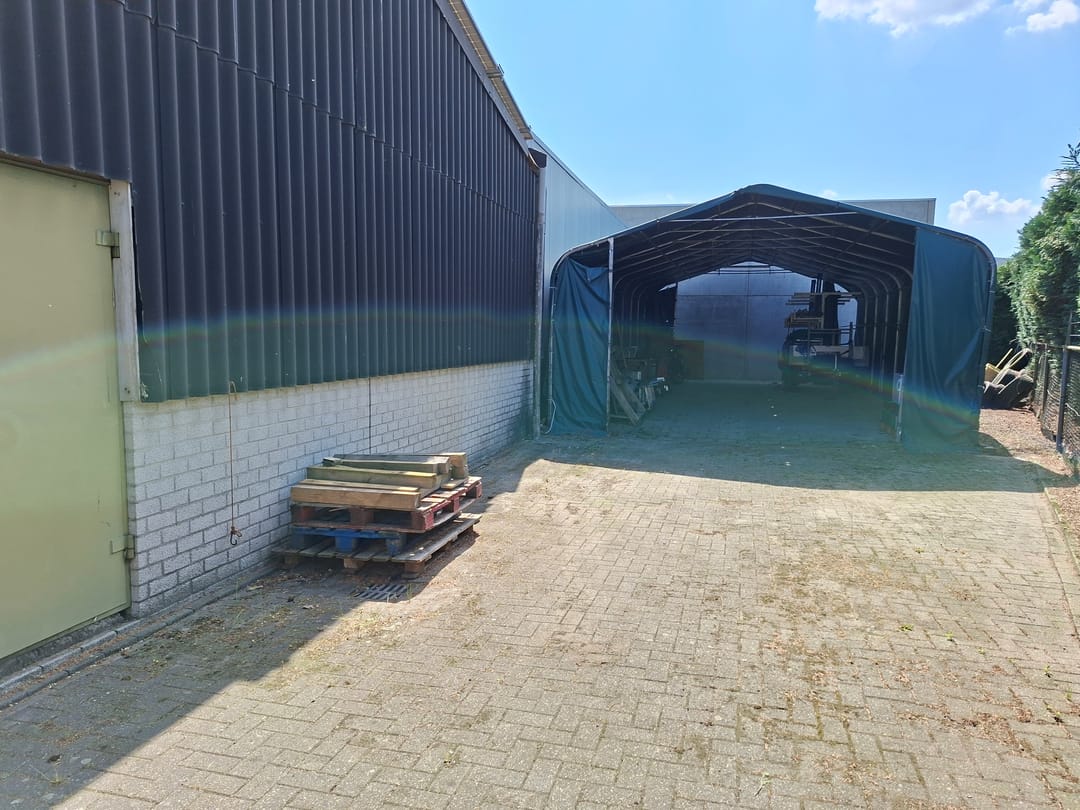 De volledig geïsoleerde ruime bedrijfshal, in een U-vorm, is ook bereikbaar via een elektrisch te bedienen overheaddeur vanuit de oprit aan de rechterzijde van de woning. Met een betonvloer, een stalen wasbak en radiatoren. Hier bevindt zich ook de omvormer t.b.v. de zonnepanelen en een Nefit combiketel (2008). Via een houten trap toegang tot een tournesol. Achter de hal bevindt zich nog een stalen frame met een zeil.