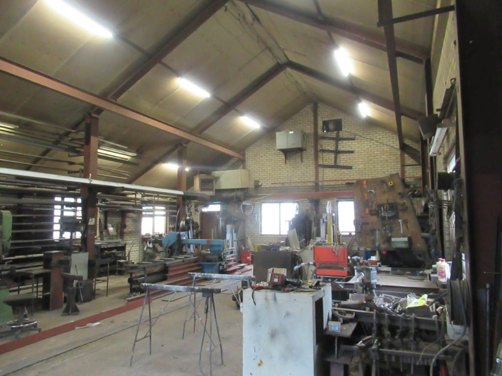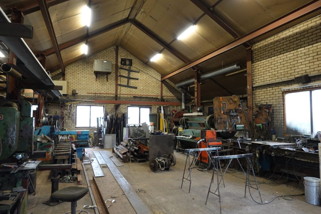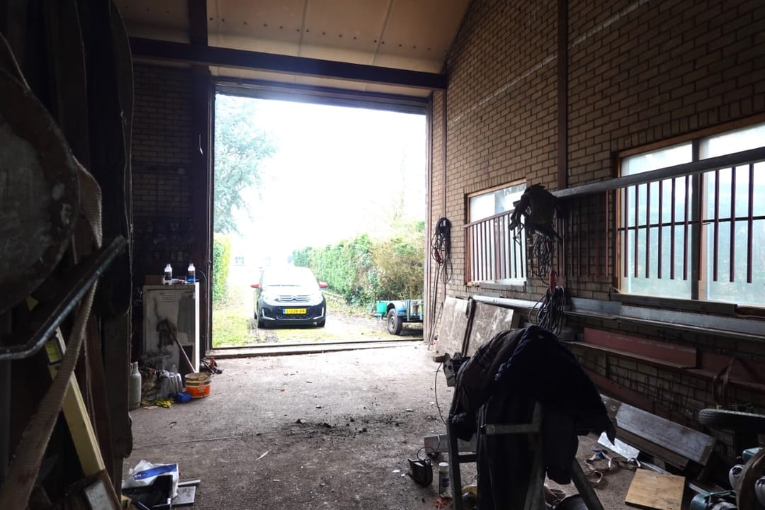 De bedrijfshal is zowel binnendoor als buitenom bereikbaar en zowel als garage, werkplaats en/of berging te gebruiken. De hal is opgetrokken uit zware stalen spanten, de wanden zijn voorzien van gemetselde gevels met spouw. Het zadeldak is gedekt met asbesthoudende golfplaten en met isolatie onderschoten. De bedrijfshal heeft een betonvloer en een afmeting van circa 175 m2. De nok zit op een hoogte van circa 8 m.