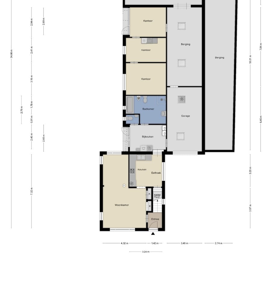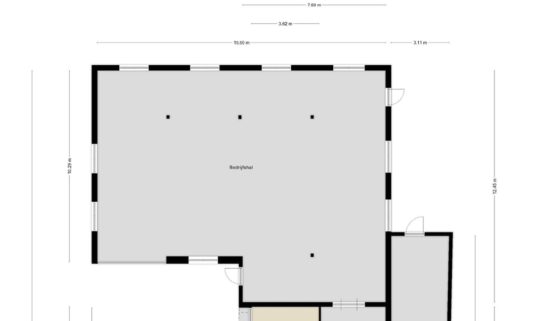 De hal is bereikbaar middels grote schuifdeuren met een afmeting van circa 4 m bij 4.20 m. Zoals gezegd zijn er ook nog twee kantoorruimtes, een kantine, een extra kleinere berging en garage aanwezig. Deze bedrijfsruimtes behelzen met elkaar nog een oppervlakte van circa 86 m2. Kortom, een woning met volop mogelijkheden voor bedrijvigheid aan huis.