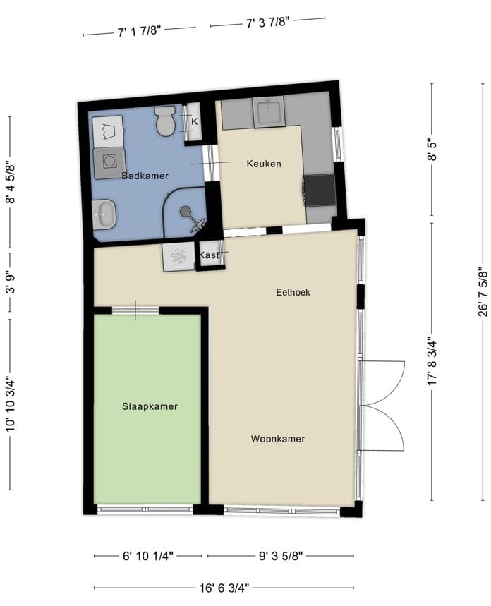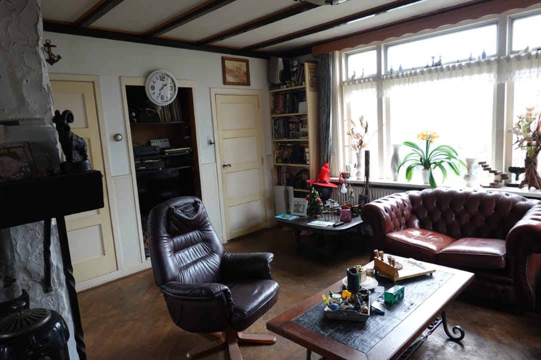 We betreden de woning via de entree aan de voorkant, waar we direct de trapopgang naar de eerste verdieping en toegang tot de woonkamer hebben. In de woonkamer vinden we een gezellige houtkachel en 2 praktische, vaste kasten.