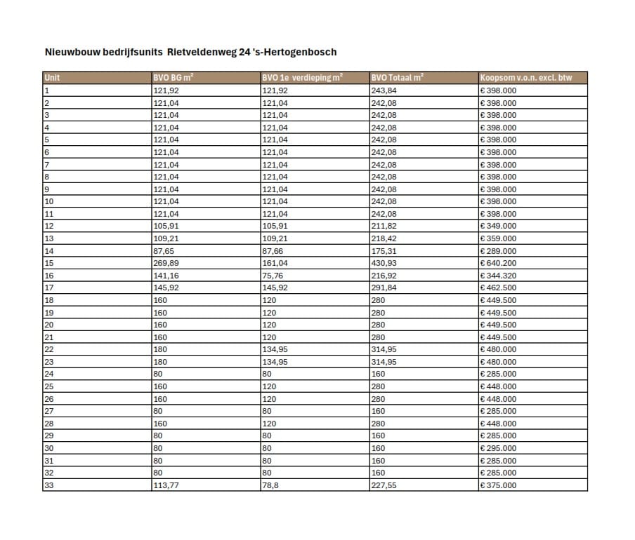 33 nieuwbouw bedrijfsunits vanaf € 285.000,00 VON excl. BTW