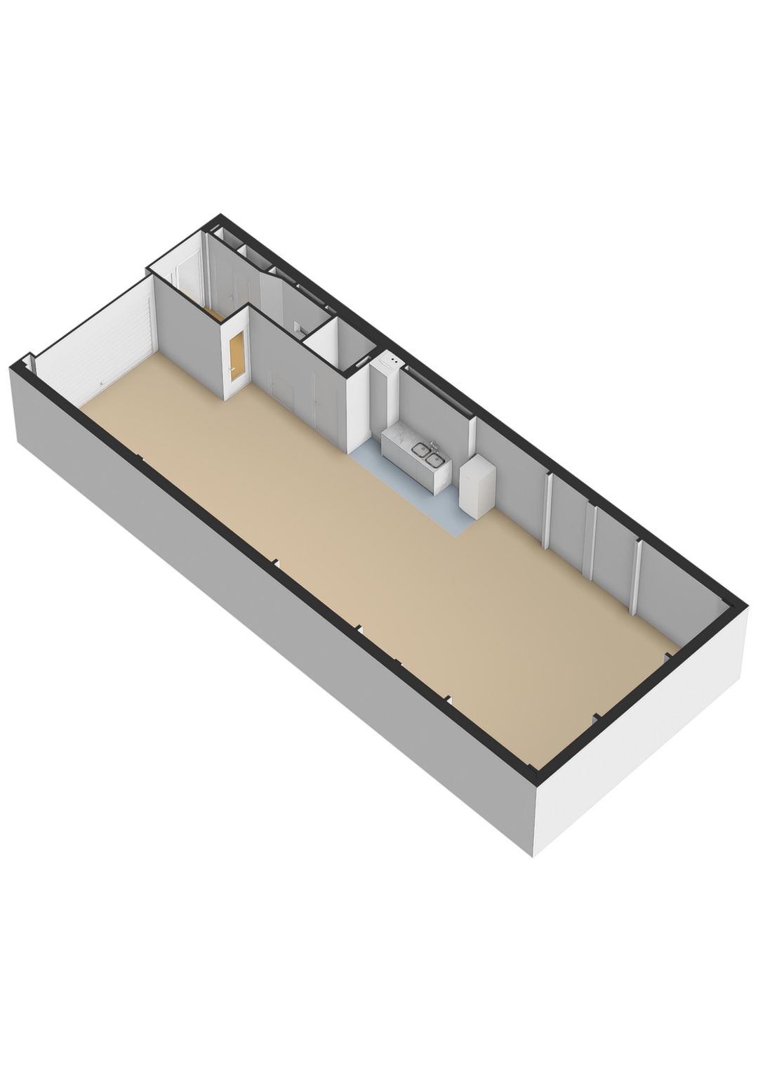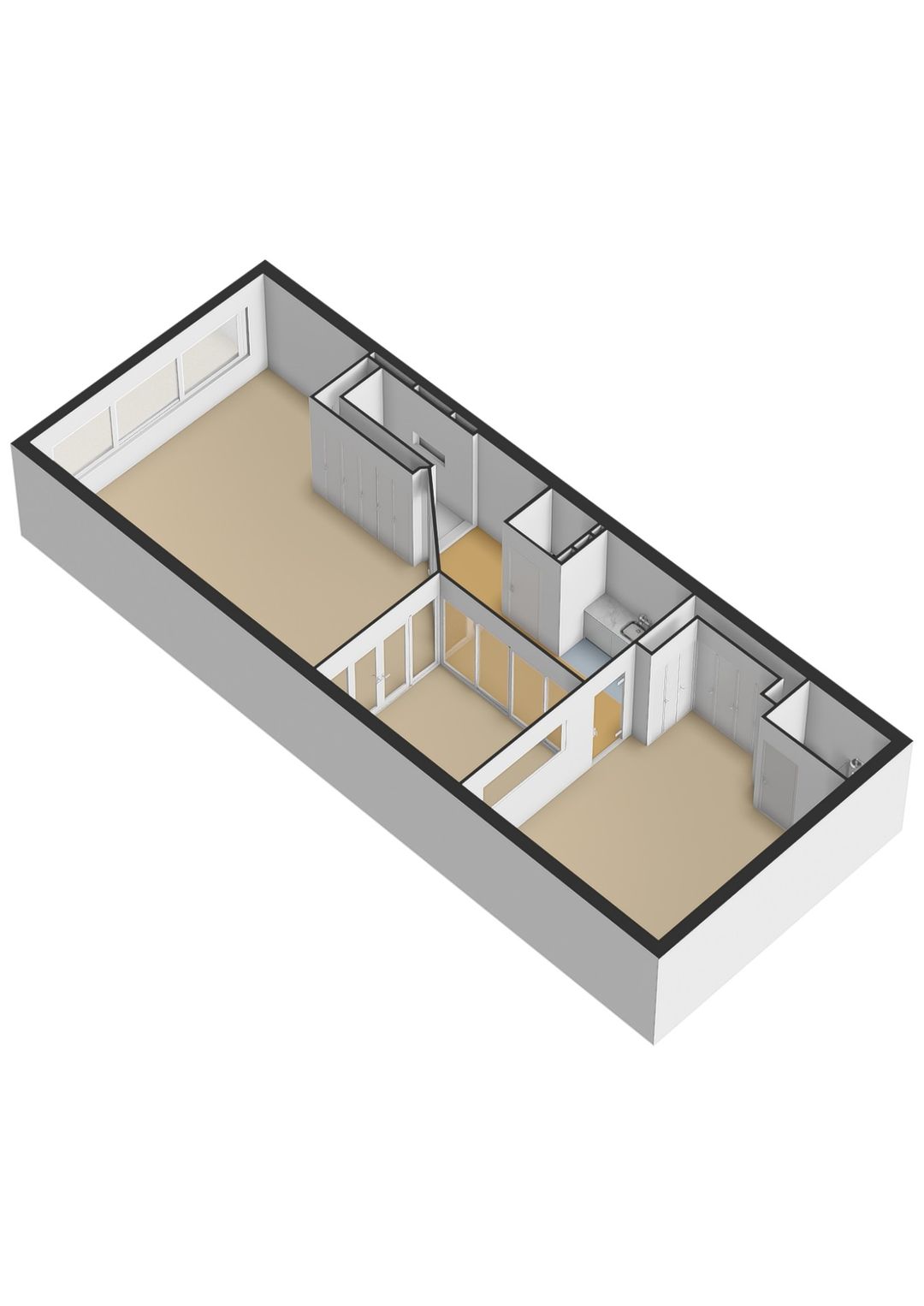 Eén ruimte betegeld, met inbouwkasten en doucheruimte met wastafel