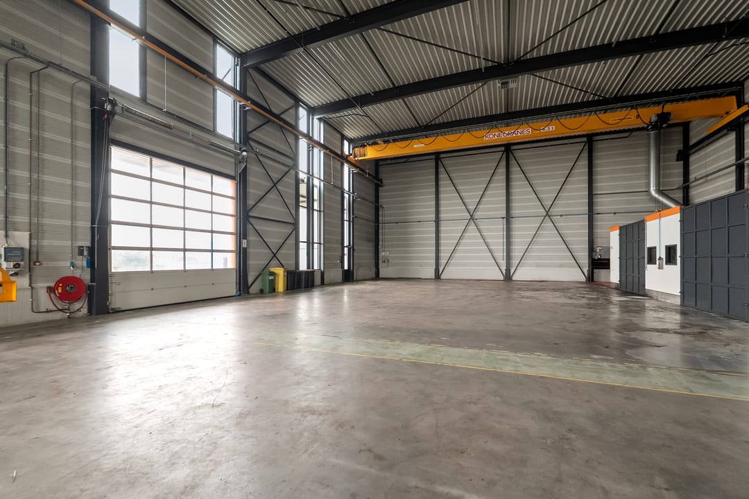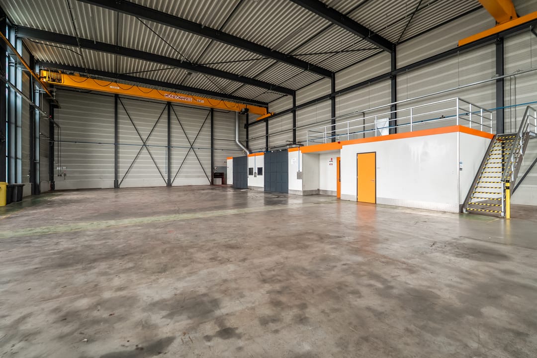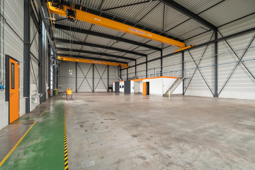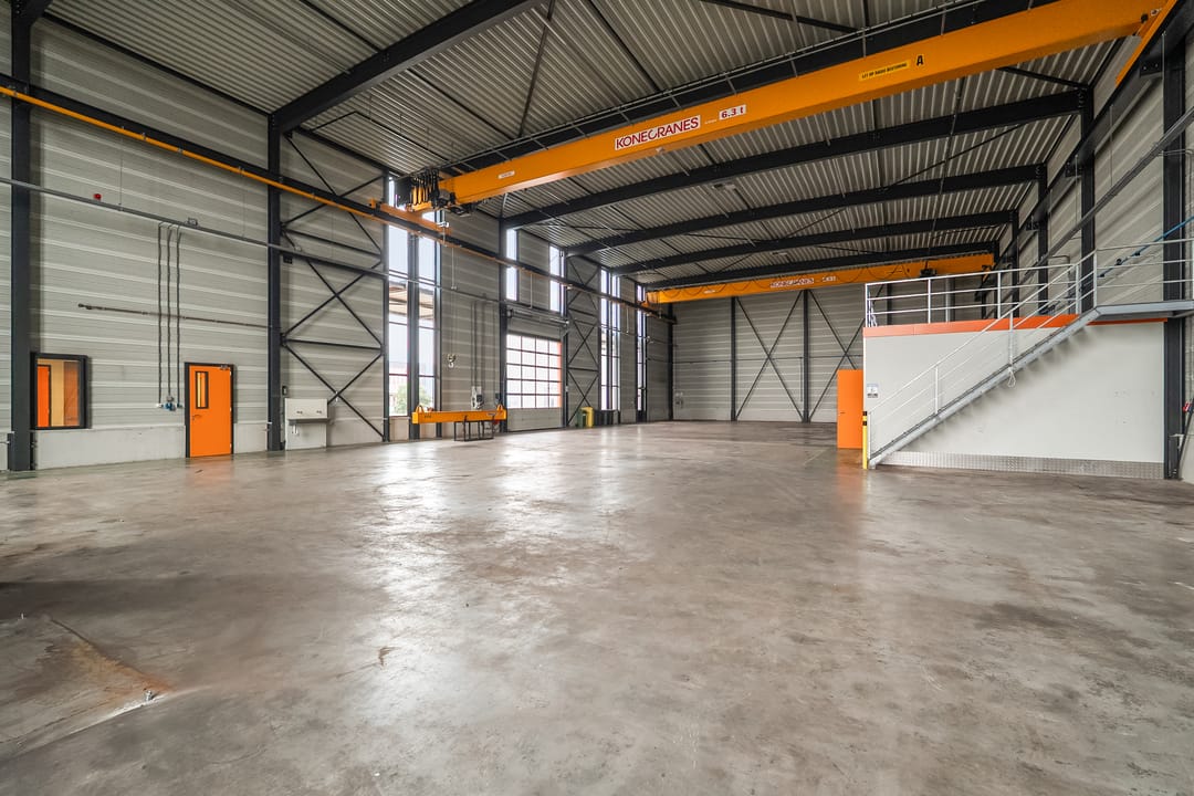 Loods: 2 x kraanbaan 6,3 ton, overheaddeur, bergingen/opslag, vloeistofdichte betonvloer.