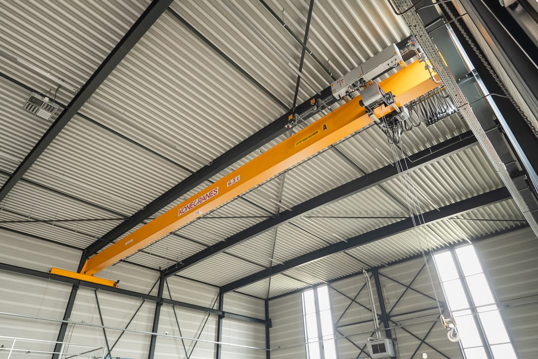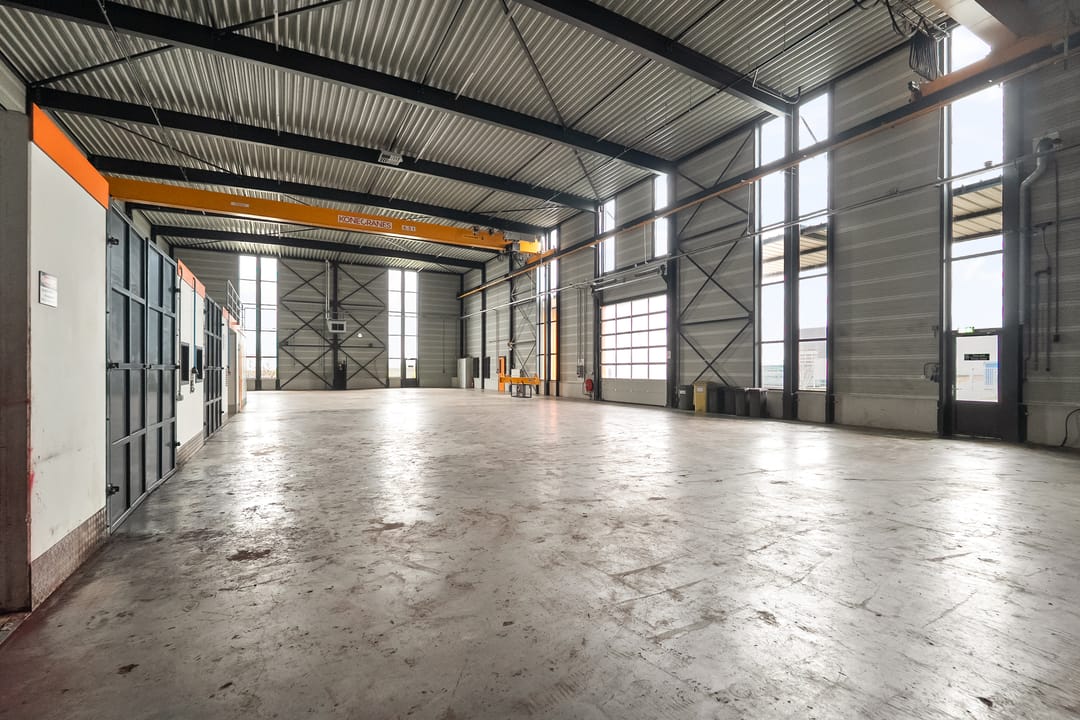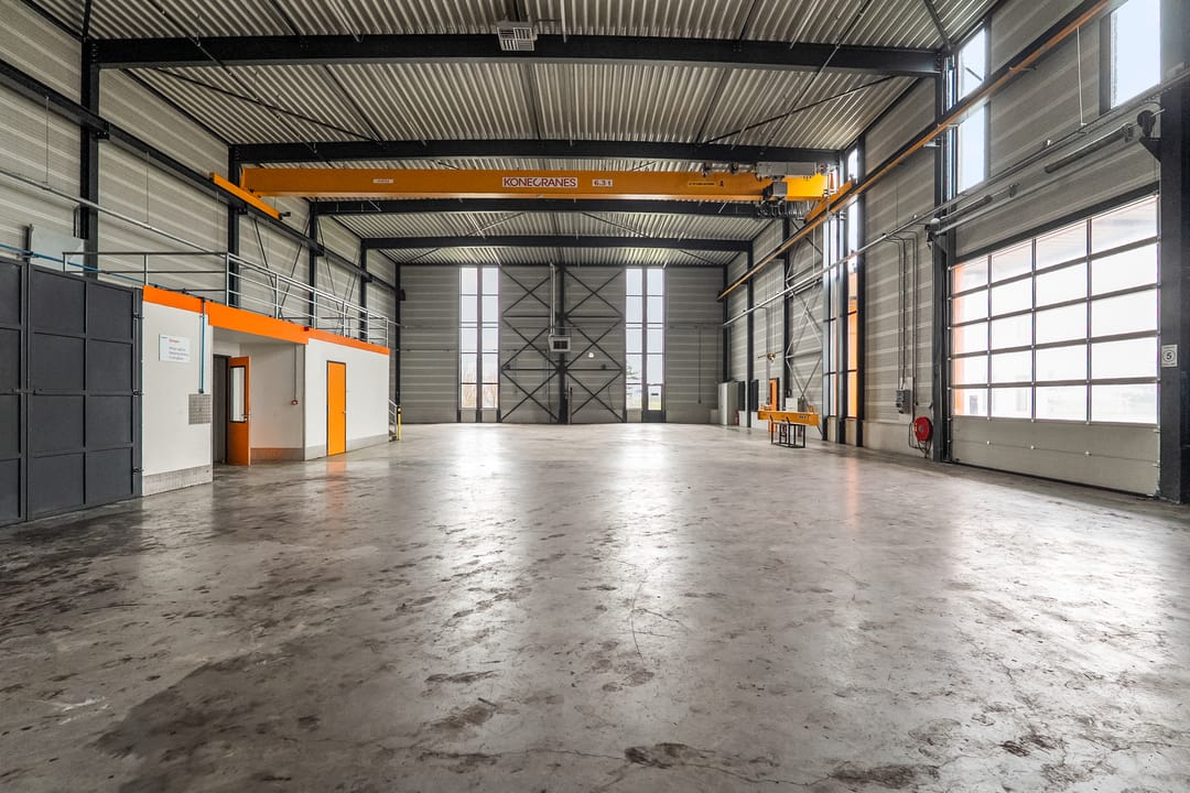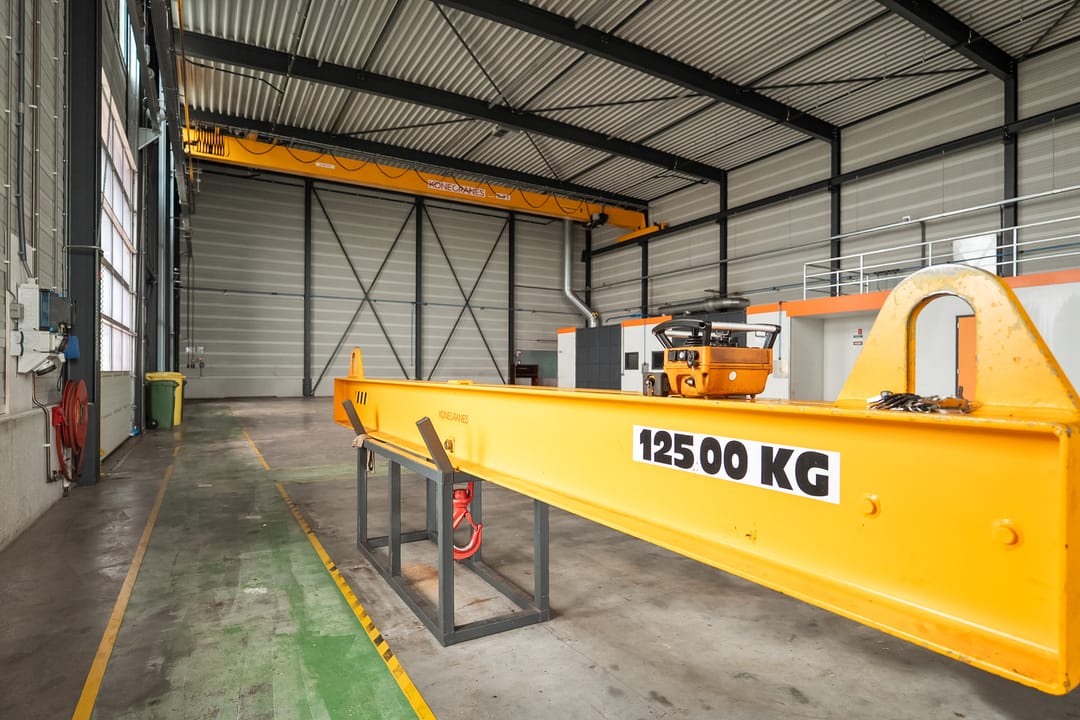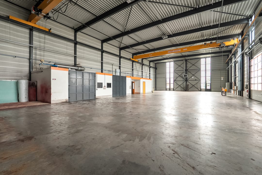 Loods: 2 x kraanbaan 6,3 ton, overheaddeur, bergingen/opslag, vloeistofdichte betonvloer.