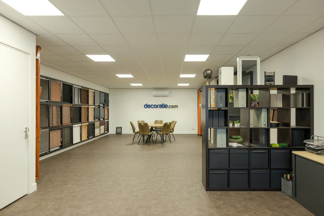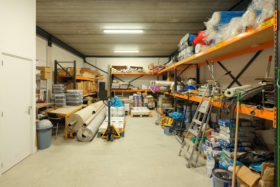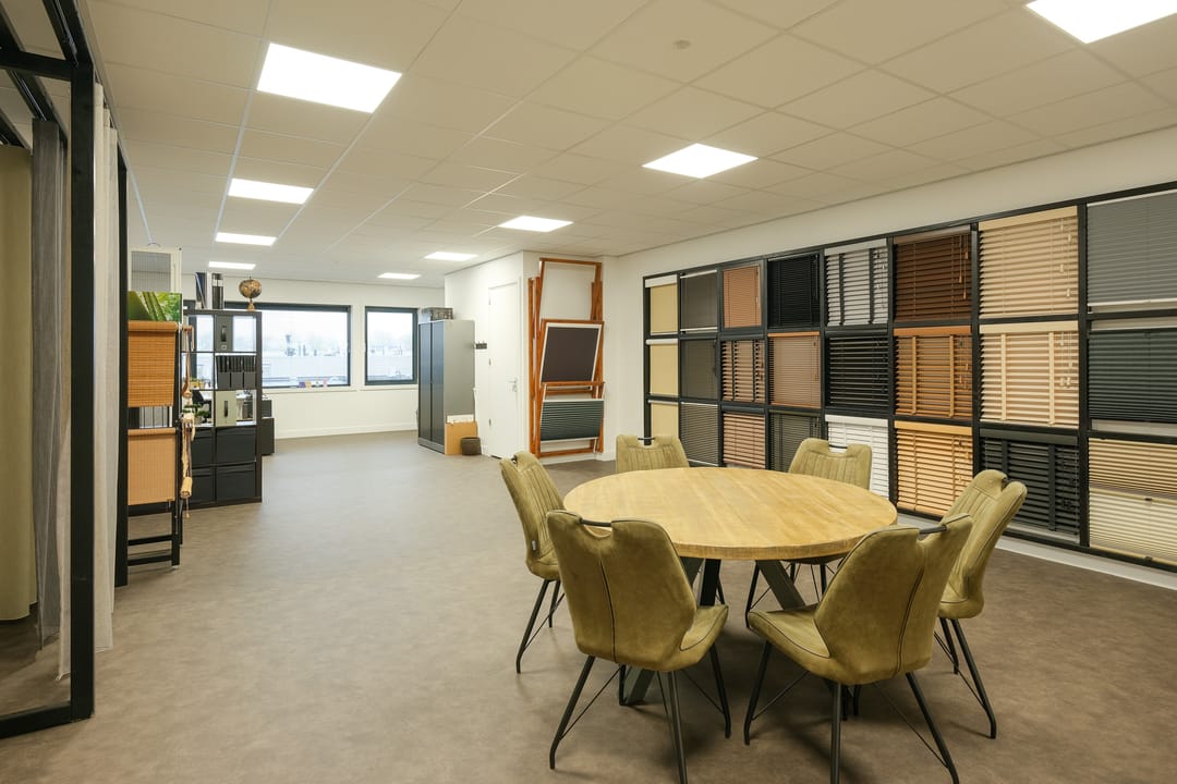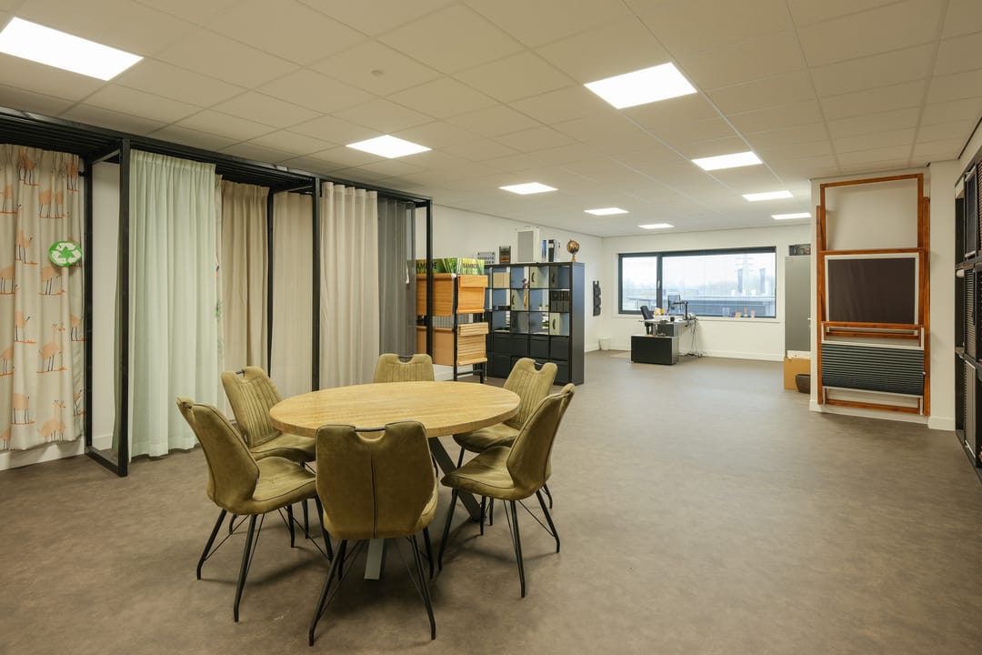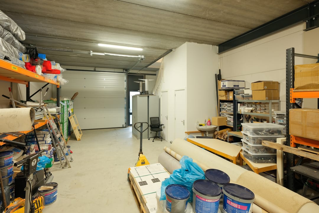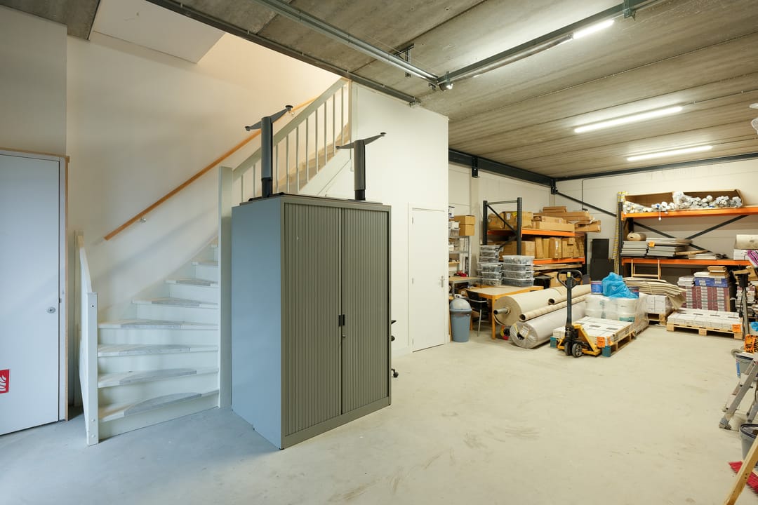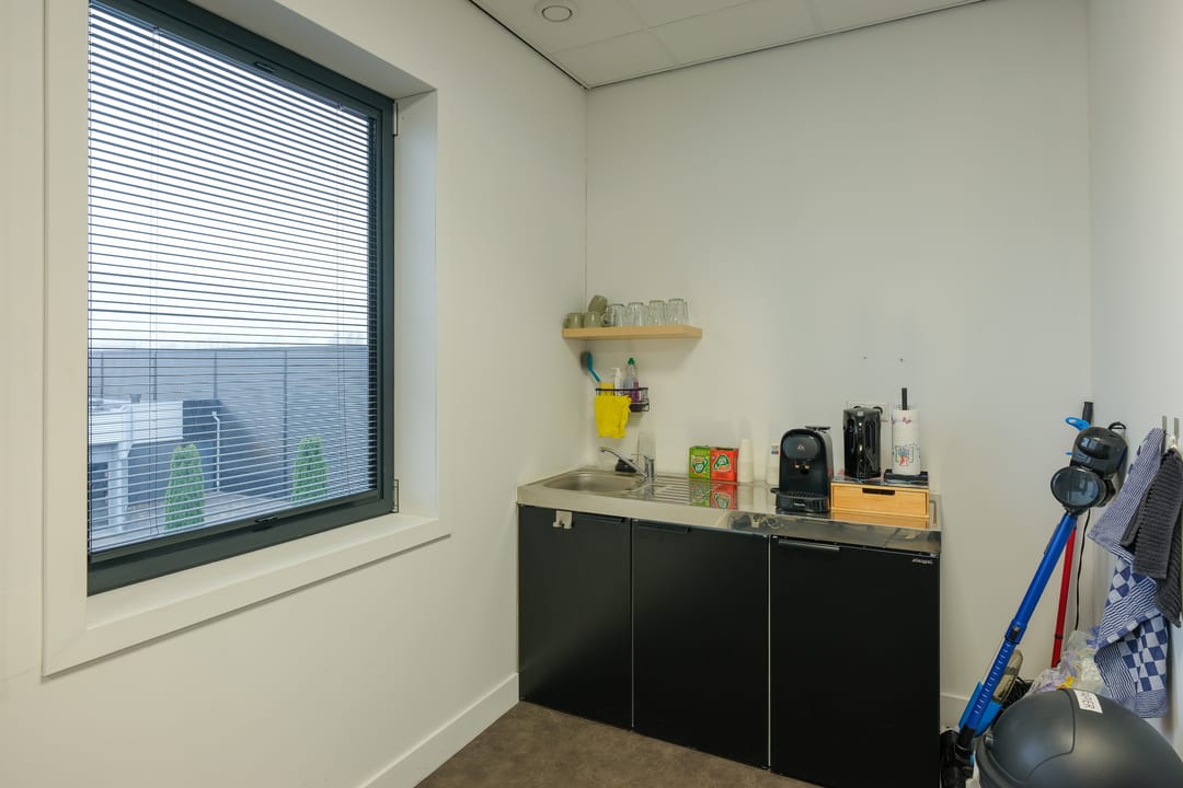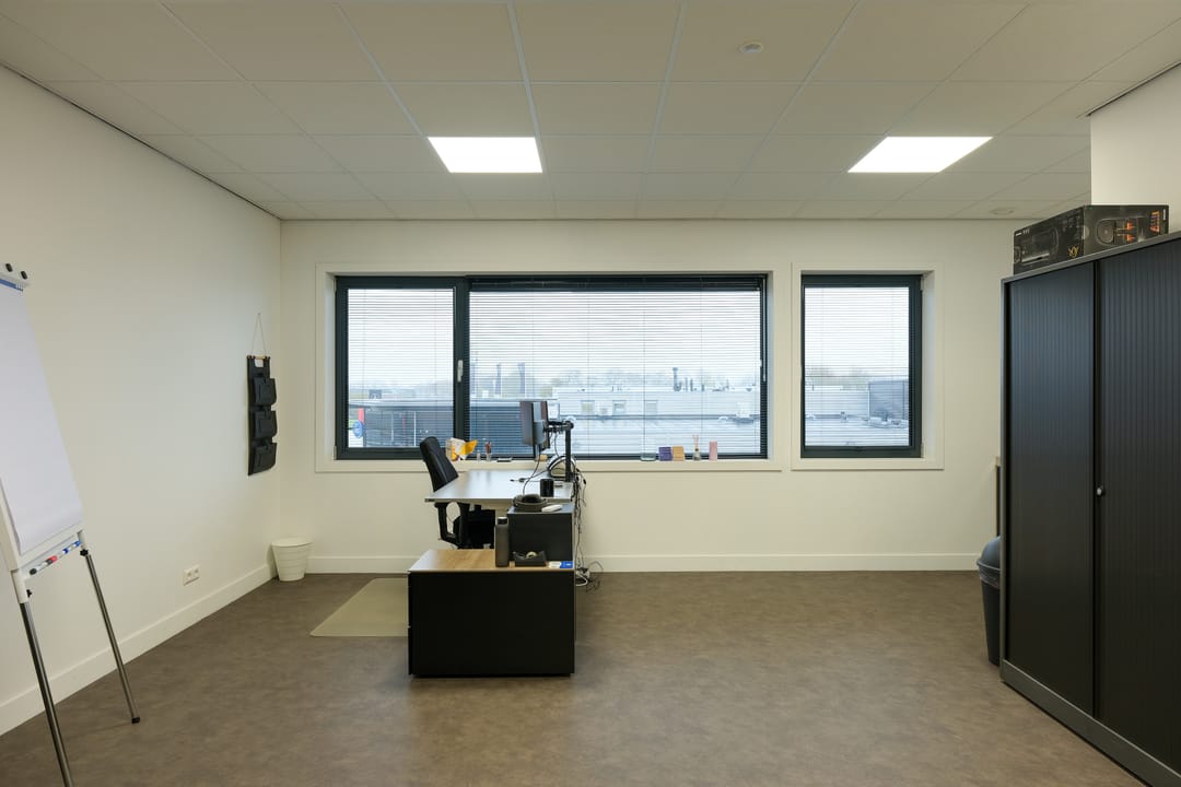 • Verdieping: kantoorruimte, split airco unit (die koelt en verwarmt), afgewerkte wanden, systeemplafond, LED-verlichting, data/elektra en keukenblok met wastafel, boiler en koelkast.