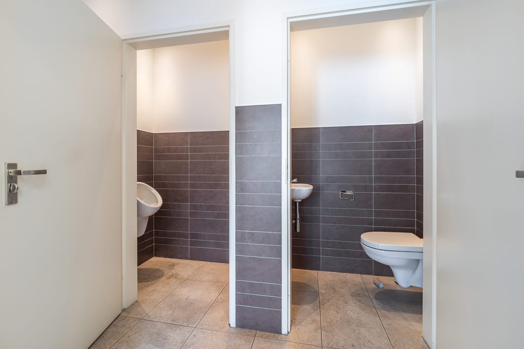 Daarnaast is er een zij-entree die direct toegang biedt tot een tweede hal met extra sanitaire voorzieningen en doorgang naar de werkplaats — ideaal voor personeel of leveranciers.