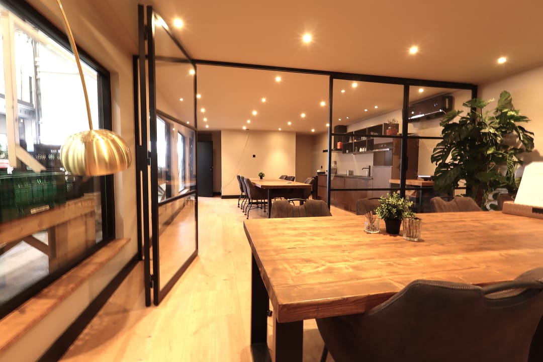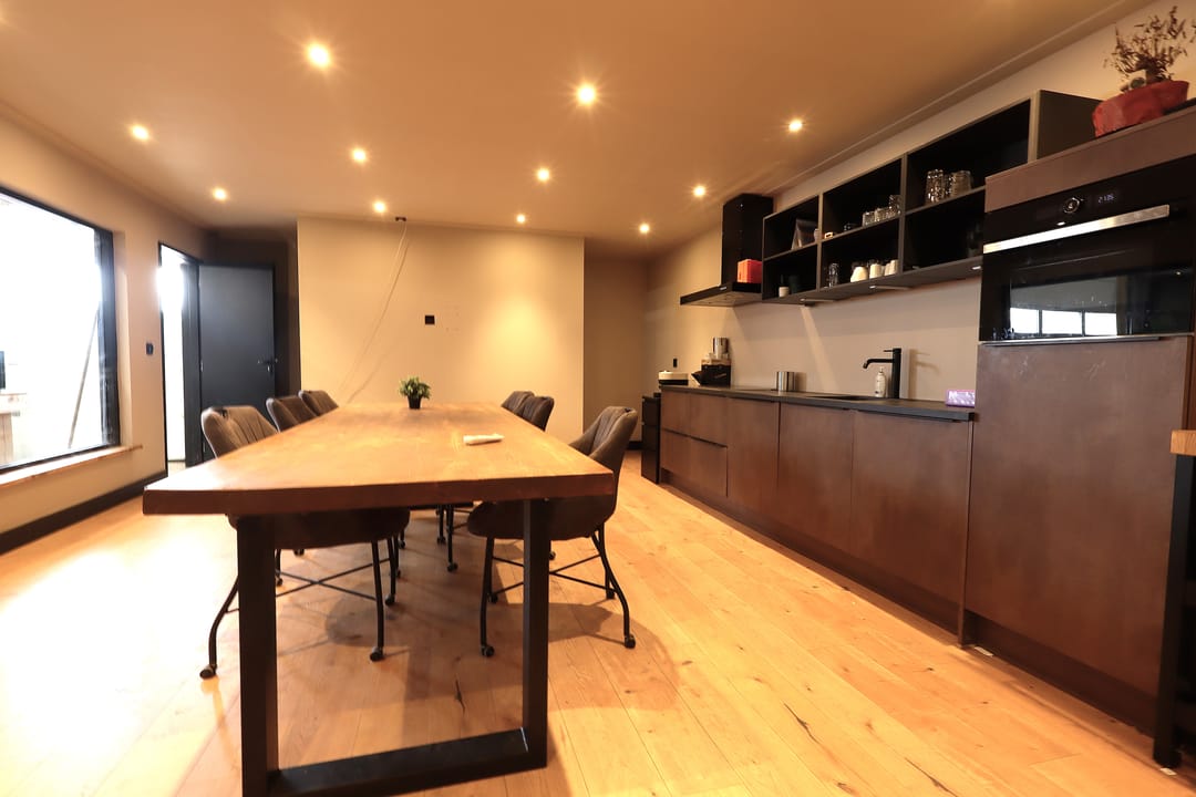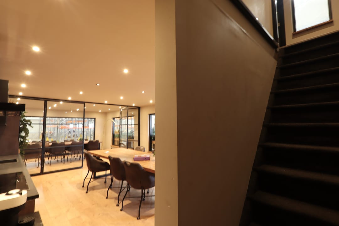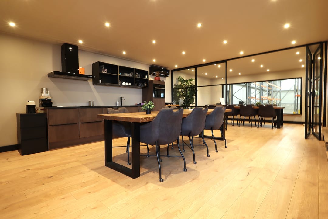 Kantoor/vergader/lunchruimte van 9.44m x 4.81m met meterkast, trapkast, airconditioning, trapopgang, inbouwspotjes, laminaatvloer, strak gestucte wanden en plafonds, te openen glazen scheidingswand en een keukenblok (bj. 2022) met diverse inbouwapparatuur zoals een inductie kookplaat (5-pits), afzuigkap, 2 koelkasten, vaatwasser en een combioven.
