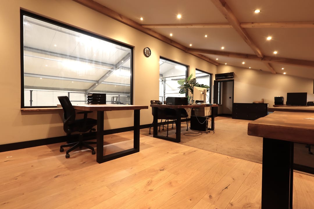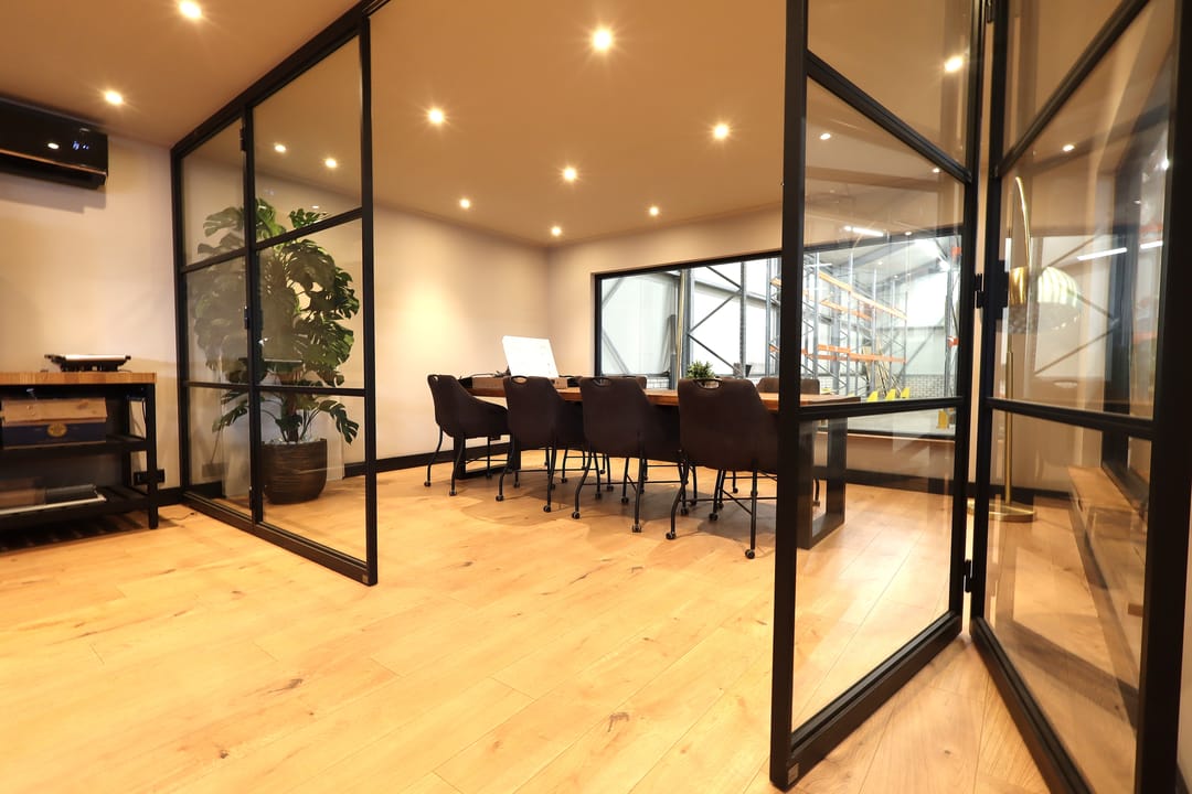 Kantoorruimte van 9.44m x 4.81m met airconditioning, inbouwspotjes, laminaatvloer en strak gestucte wanden en plafonds,