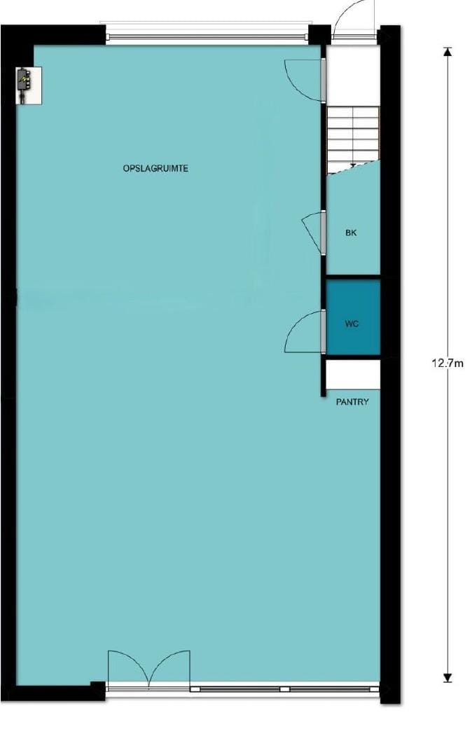 On one side, there is a double door leading to the showroom; on the other side of the building, there is an entrance door and an overhead door. The ground floor features a restroom and a small kitchenette.