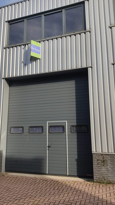 Bedrijfsruimte met overheaddeur aan voorzijde, tegelvloer, keukenblokje en toiletruimte. De bedrijfsruimte is voorzien van verlichting, echter er is ook voldoende daglichttoetreding.